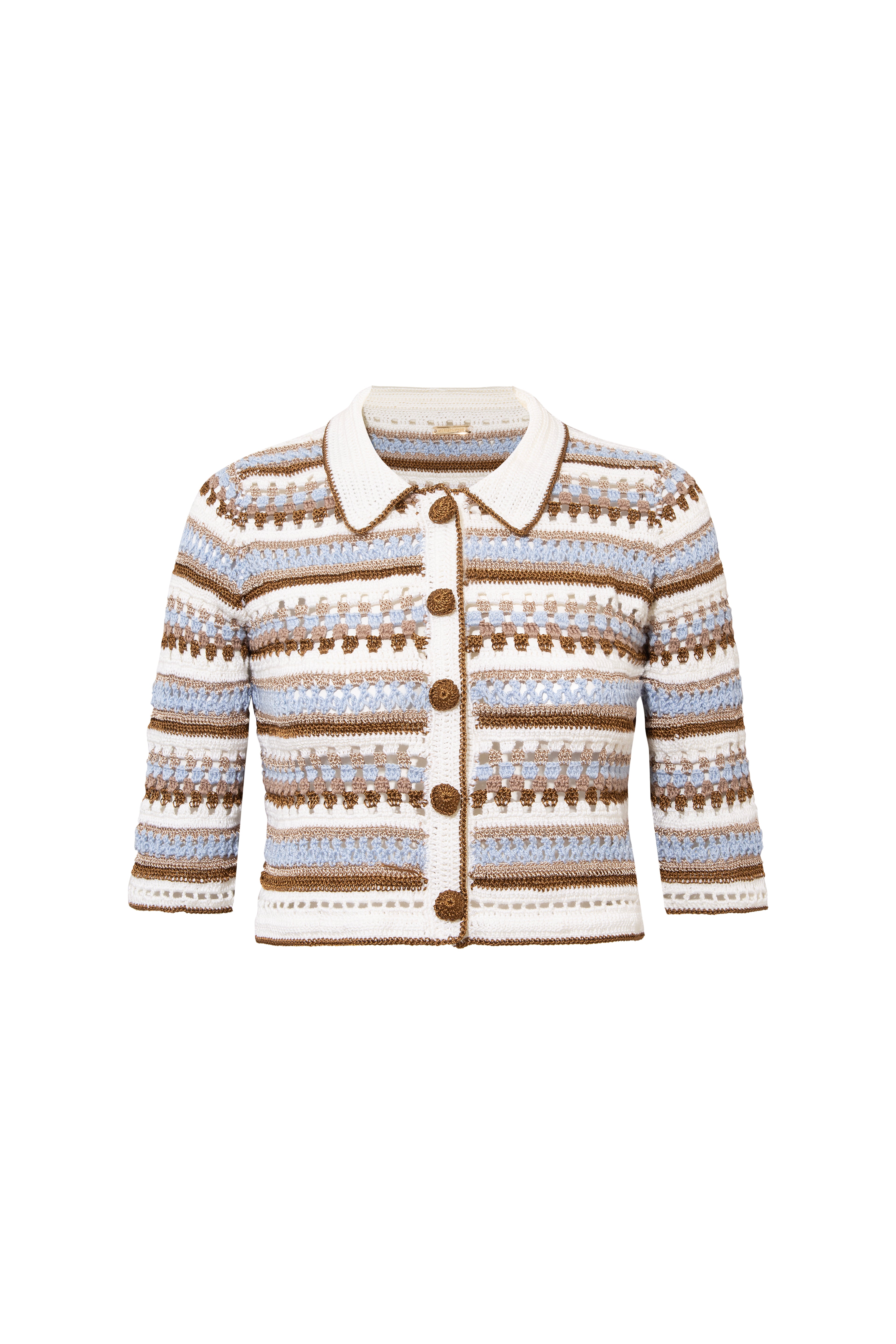 Crafted with artisanal care, this cardigan showcases intricate crochet artistry in a vibrant, playful design. Adorned with a unique combination of varied motifs, it is crocheted with colorful threads that bring striped texture. The elasticized waist ensures a flattering fit, making it a perfect piece to transition effortlessly from day to night.