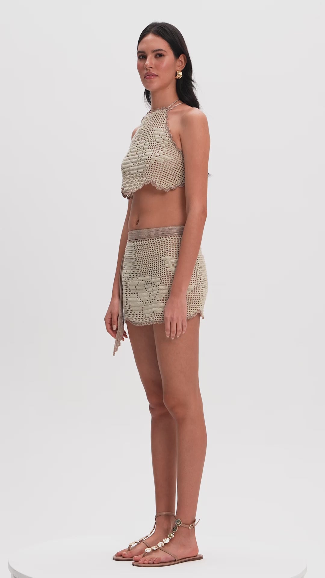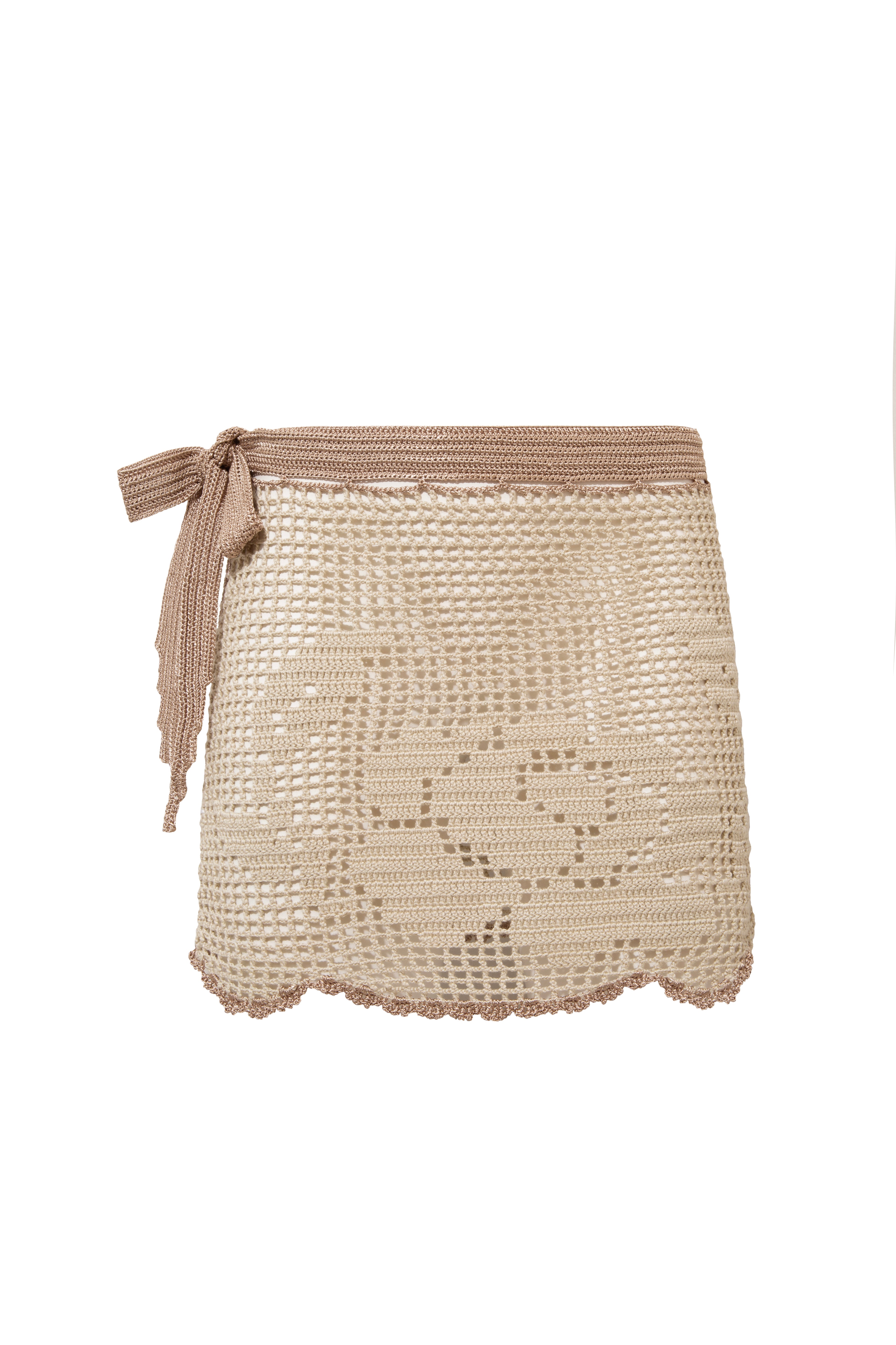 A delicate handcrafted crochet skirt that weaves timeless artistry with feminine elegance. Designed with a romantic rose motif at the hem that evokes a lace-like finish. A chic statement piece, it can be styled effortlessly with its matching top or worn alone for a refined, versatile look.