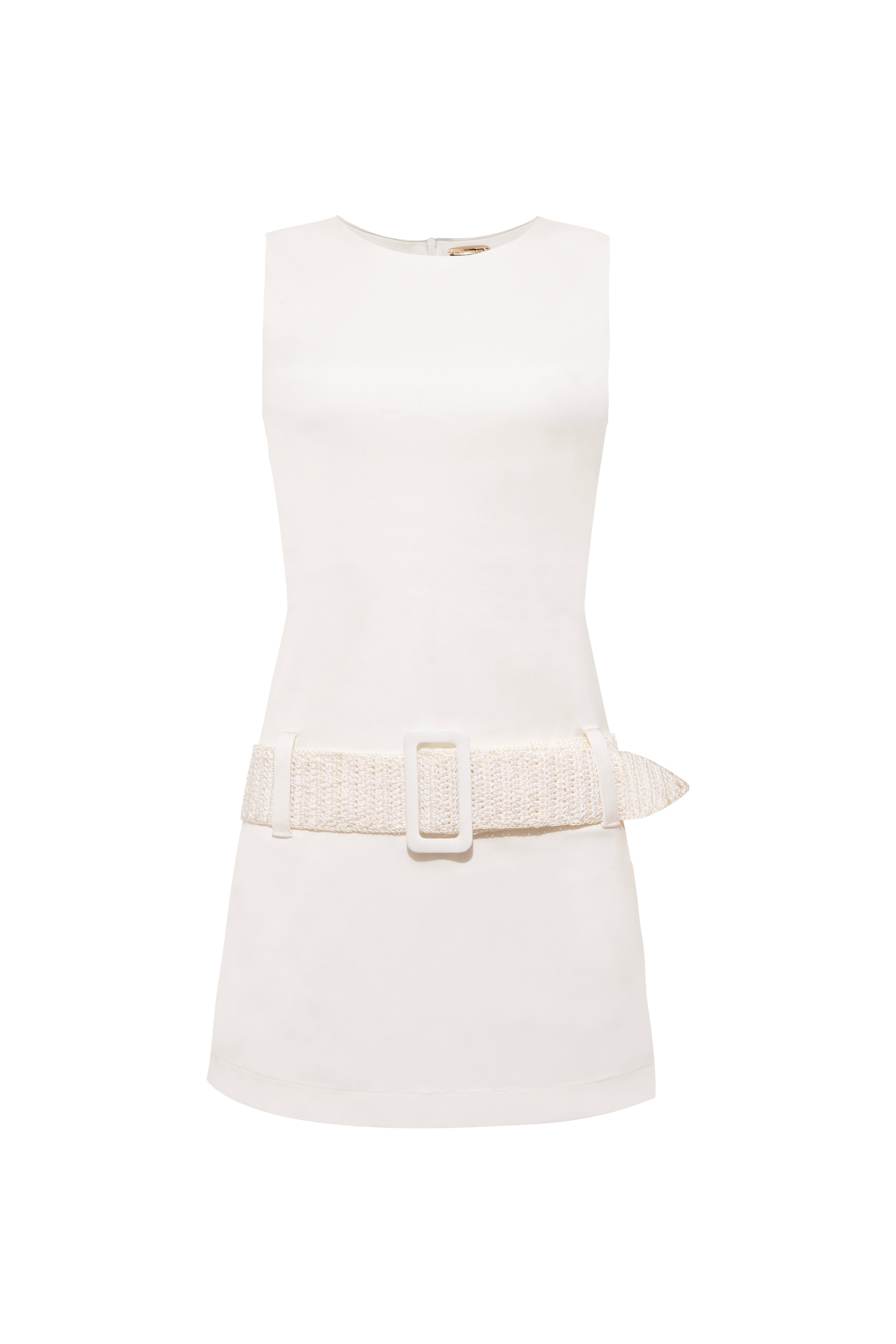 A retro-inspired mini dress that blends denim charm with artisanal touches. The hand-knitted belt detail at the hip adds a unique textural contrast and nods to vintage summer elegance.