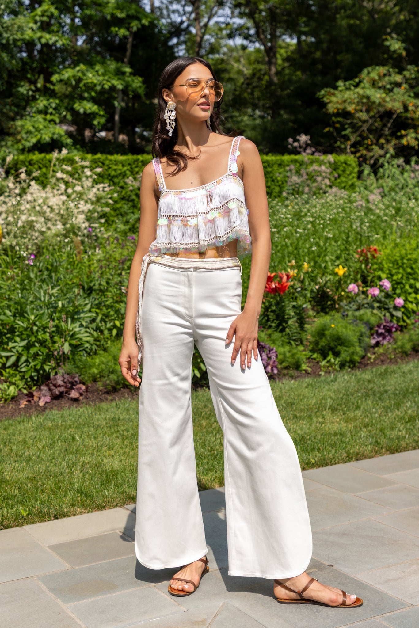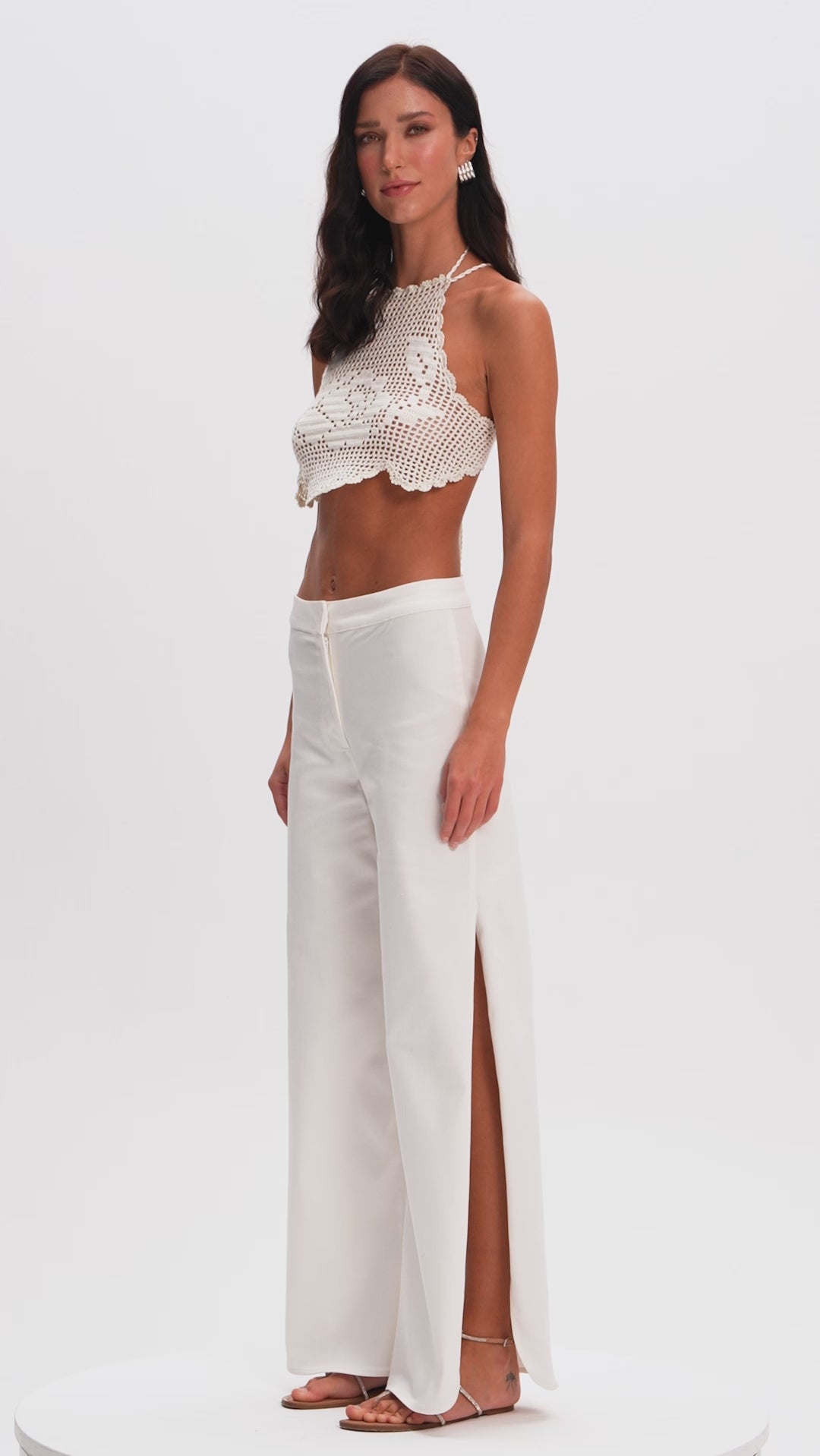 A tailored pant with a refined retro edge. Designed with side slits shaped in soft oval curves, this style features a front placket with an inner metallic hook closure for a clean finish.