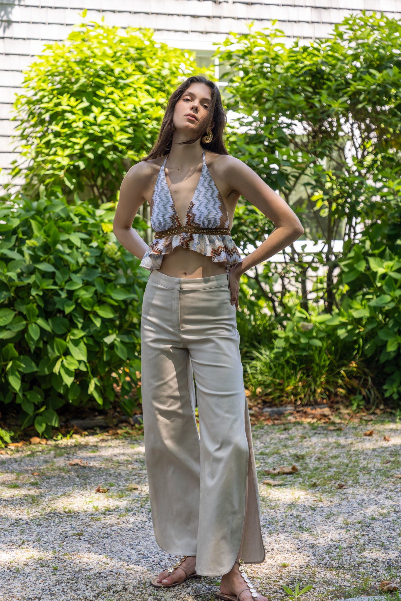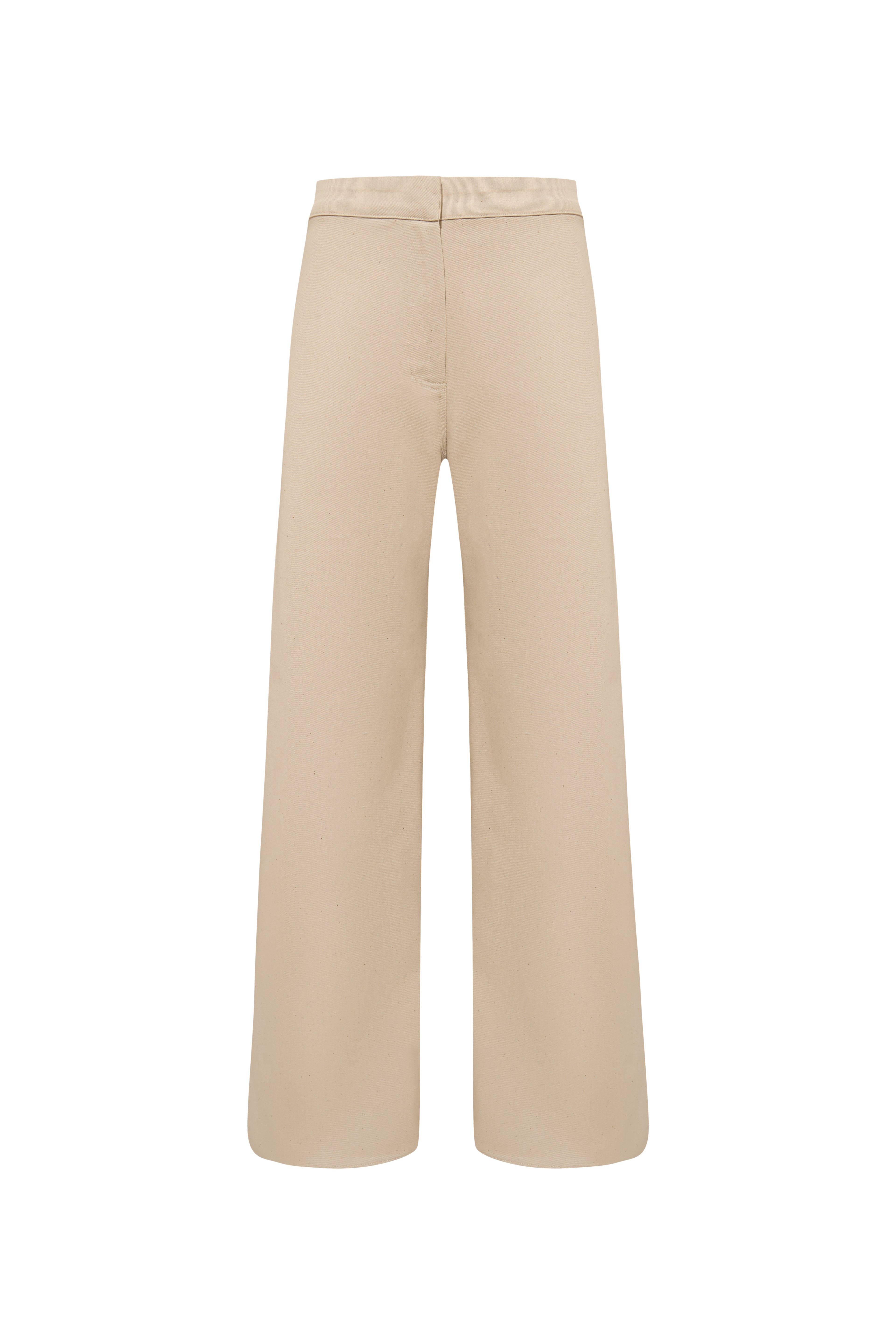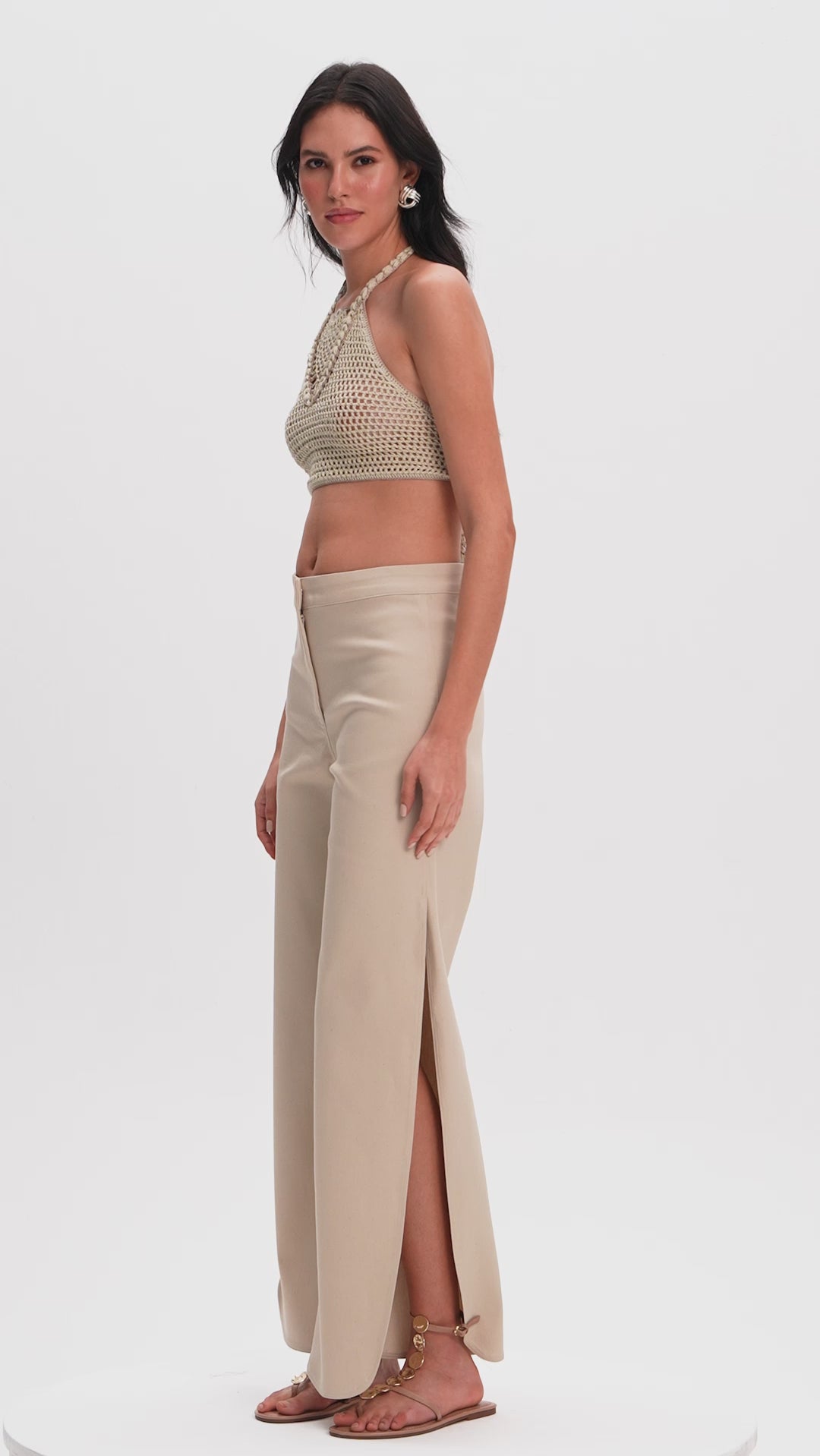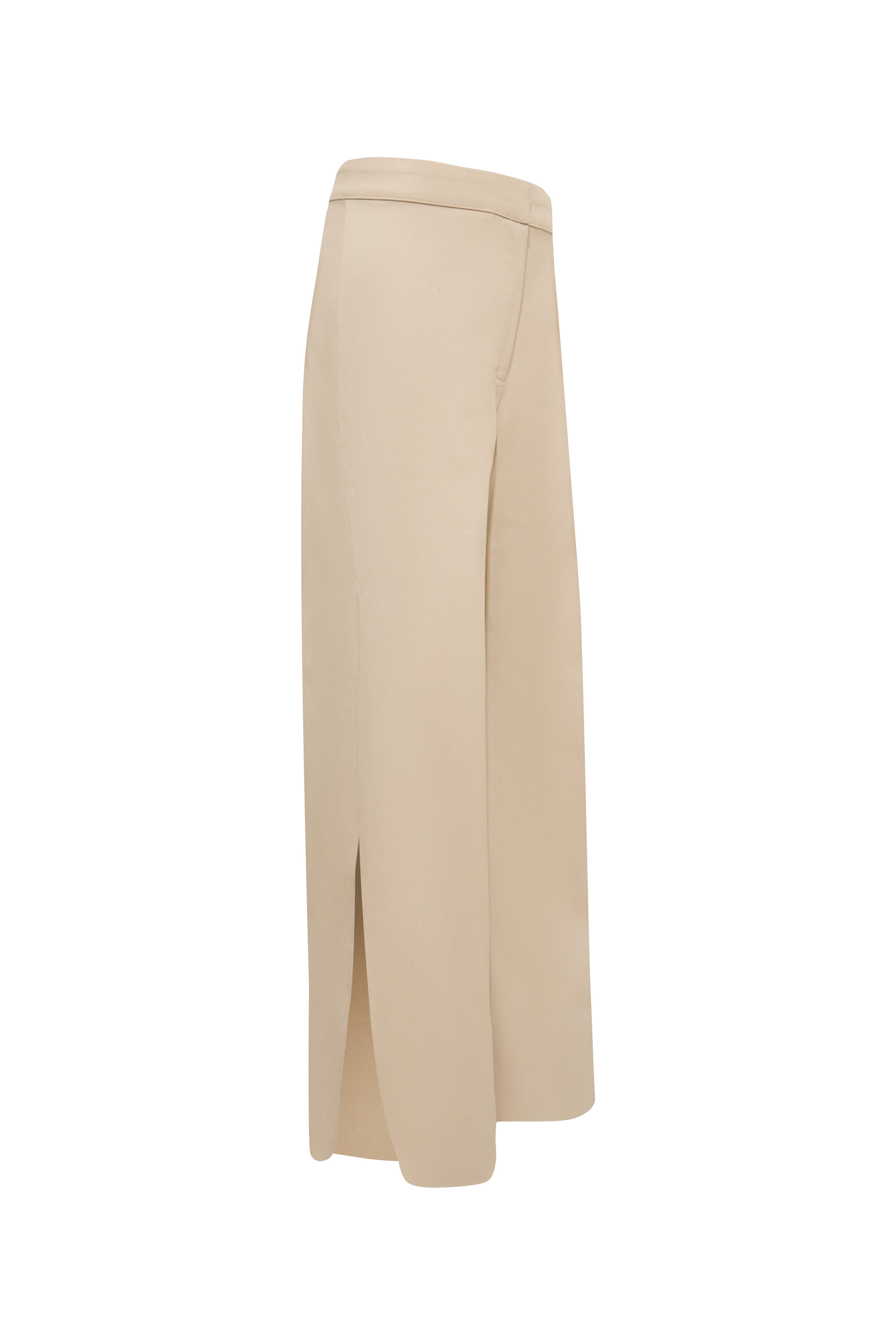 A tailored pant with a refined retro edge. Designed with side slits shaped in soft oval curves, this style features a front placket with an inner metallic hook closure for a clean finish.