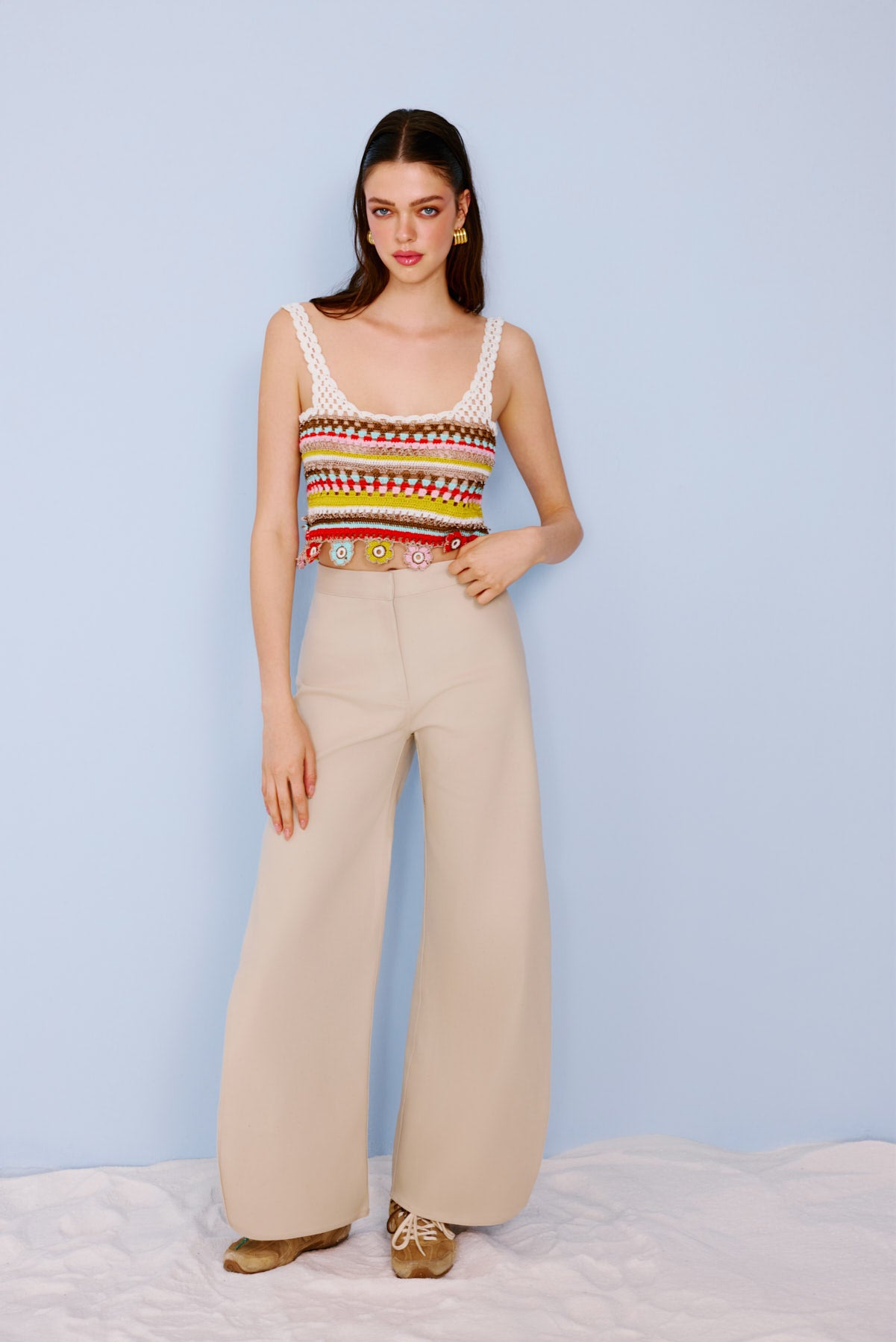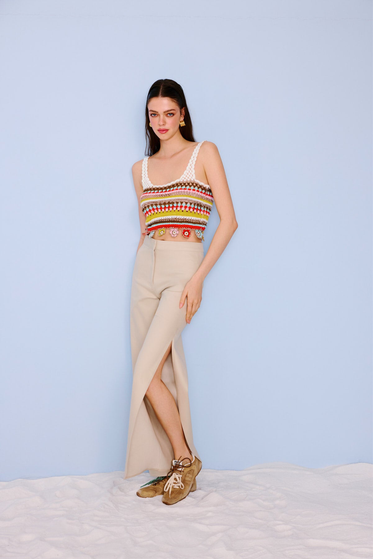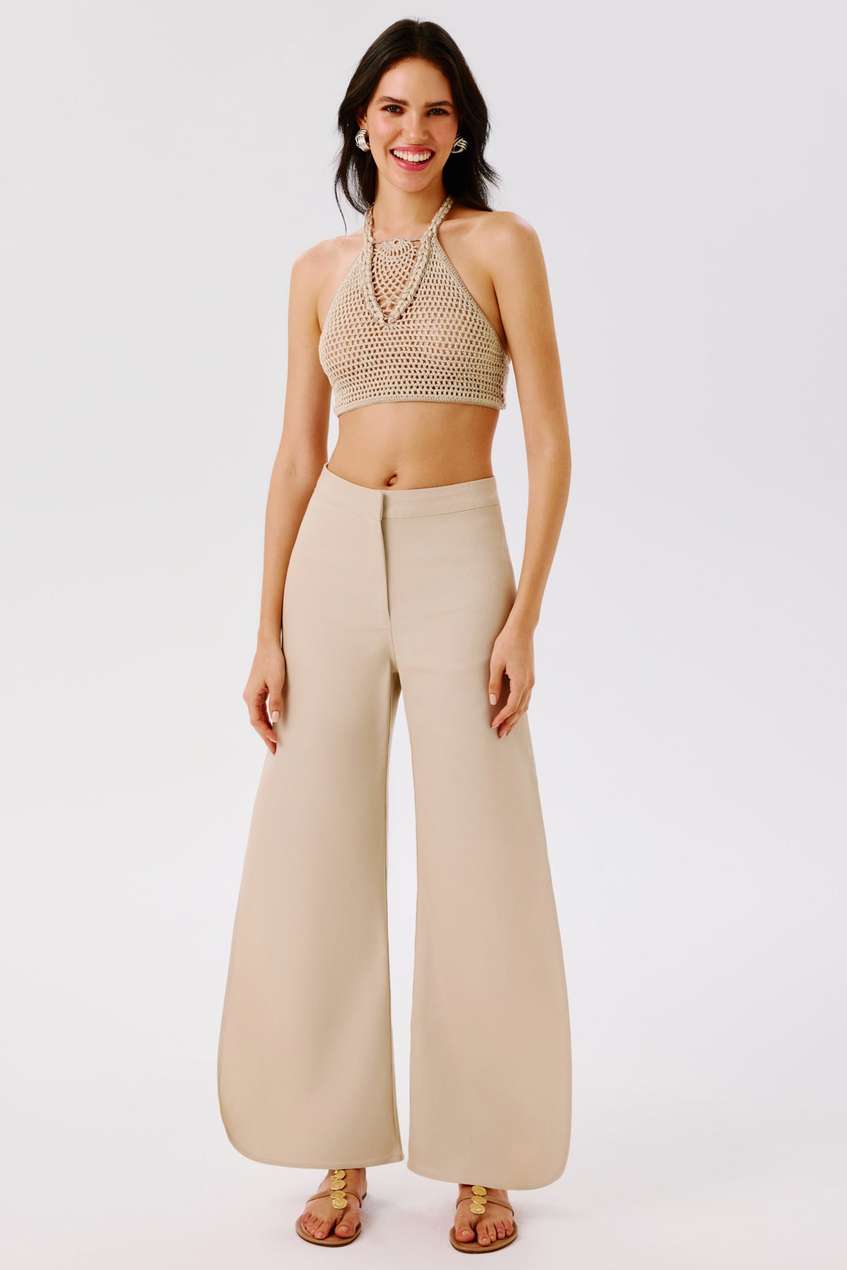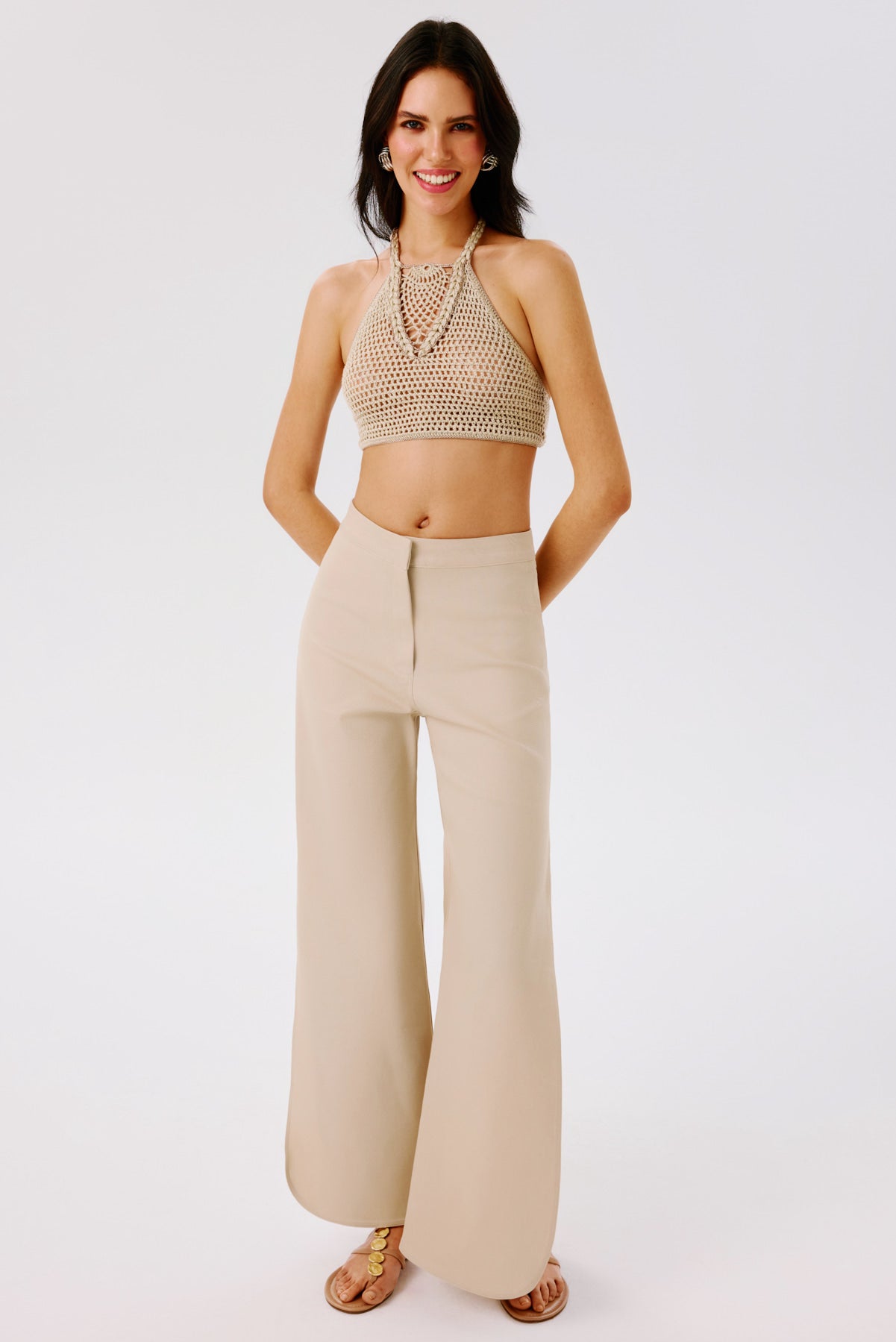 A tailored pant with a refined retro edge. Designed with side slits shaped in soft oval curves, this style features a front placket with an inner metallic hook closure for a clean finish.