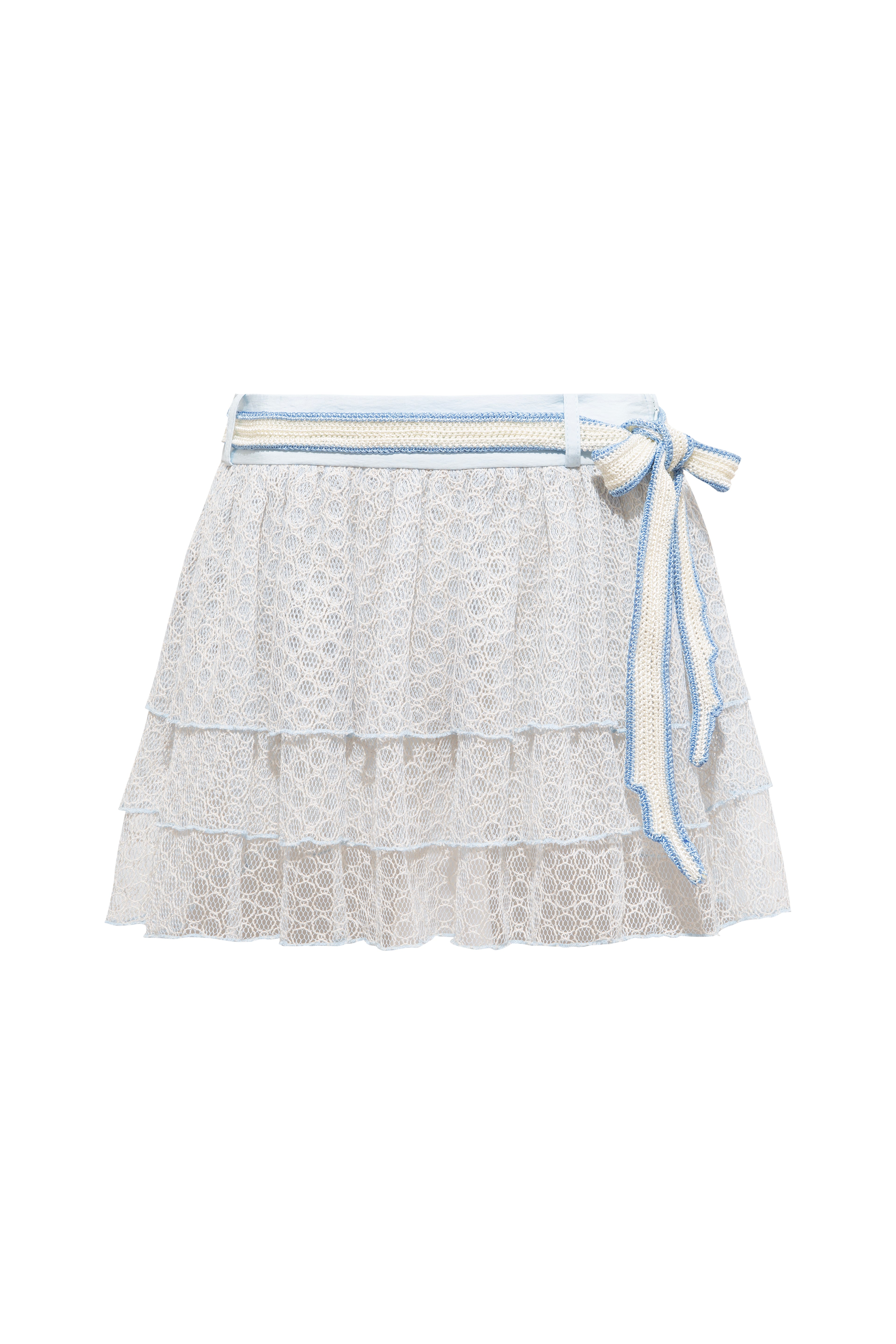 A playful ruffled mini skirt crafted from three layers of delicate lace. This piece blends texture and elegance for a charming, feminine touch. Perfect for pairing with tops or blouses for a romantic summer look.