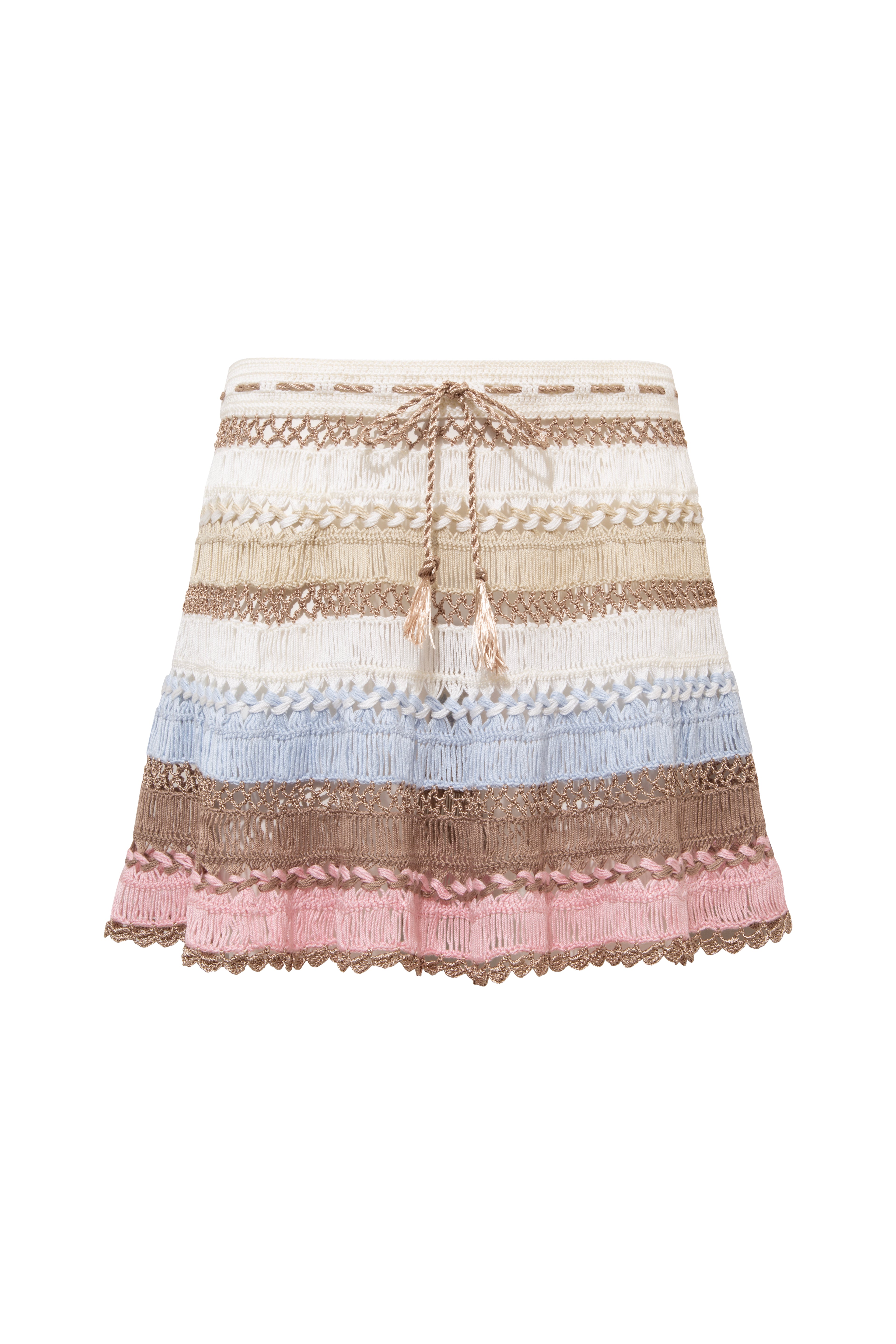 A graceful handcrafted crochet mini skirt designed to embody timeless elegance. This piece features a refined tiered silhouette that adds movement and charm to every step. Finished with a comfortable drawstring waist, it offers effortless wear and a flattering fit. Perfectly styled for beach days, casual outings, or dressed up for evening occasions, this skirt is a versatile addition to any summer wardrobe.