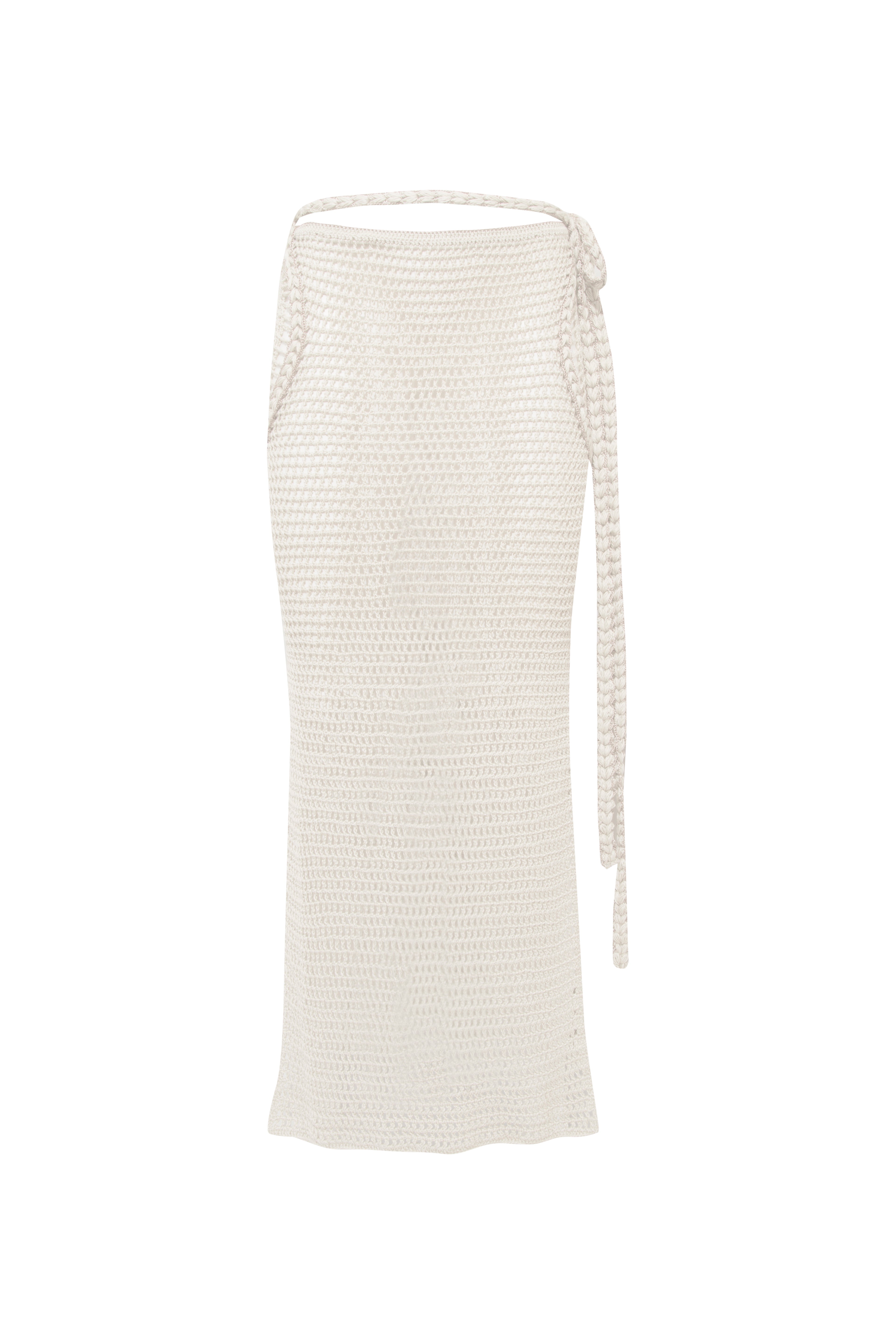 A handcrafted crochet midi skirt designed with intricate side motifs and adjustable ties for a personalized fit. Beautifully versatile, it can be styled seamlessly with the matching halter top or worn separately for effortless summer elegance.