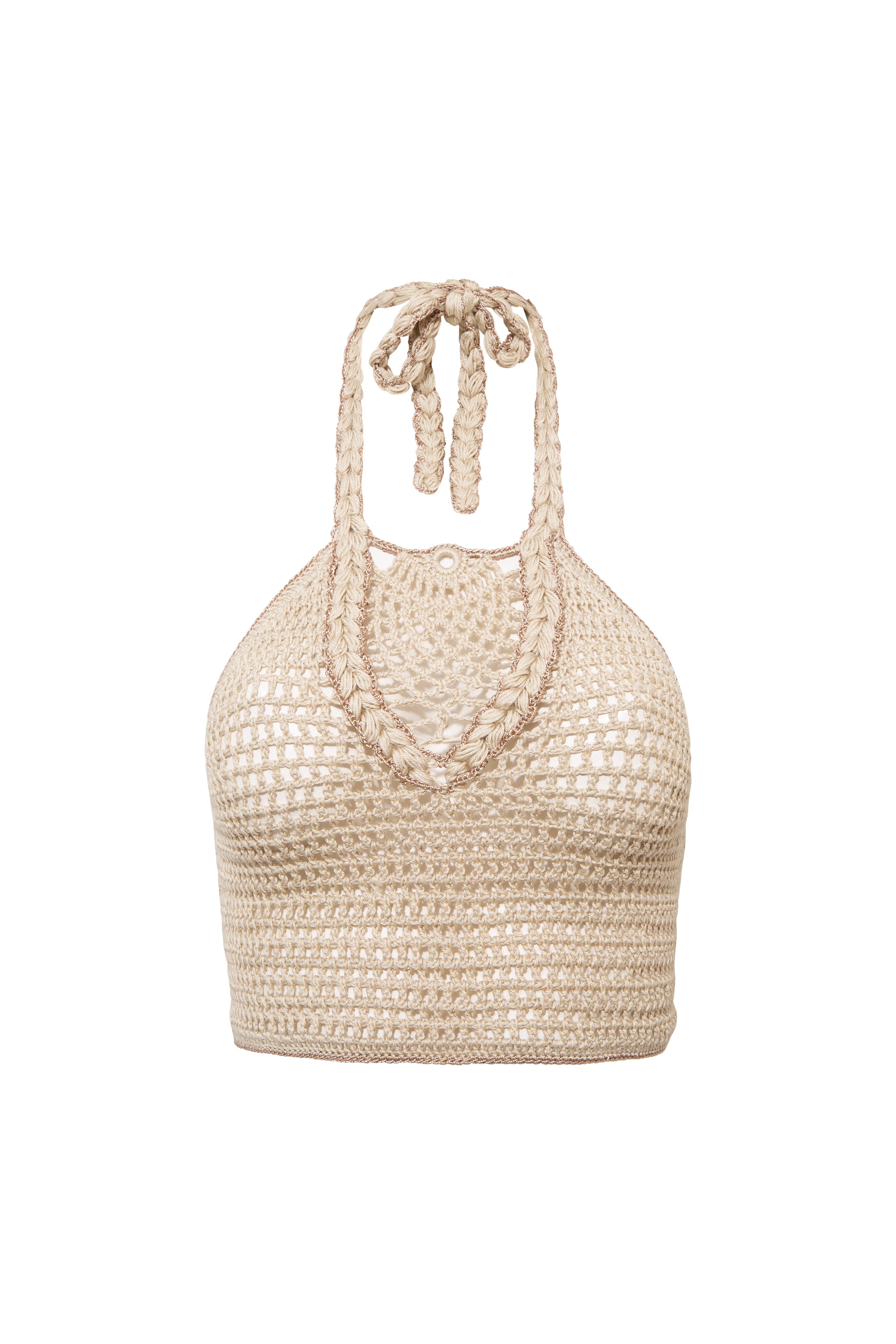 A handcrafted crochet halter top with a distinctive artisanal touch. Featuring a unique front motif that extends into braided tie details, it fastens elegantly at the neck. Perfectly versatile, it can be paired with its matching skirt or styled individually for a chic summer statement.