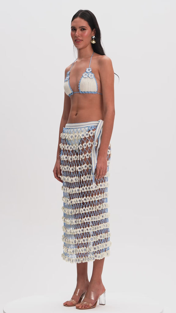 Our signature crochet maxi skirt, a beautifully versatile piece that can also be worn as an enchanting dress, is now adorned with romantic floral motifs. Carefully handcrafted by our skilled, fairly compensated artisans, this design blends sustainable luxury with timeless charm. The intricate floral detailing adds a soft, garden-inspired elegance, while the adjustable tie waist offers a comfortable one-size-fits-most fit. Perfect for pairing with your favorite swimwear or elevating your look for an evening affair, this maxi skirt is an essential for effortless, refined style.