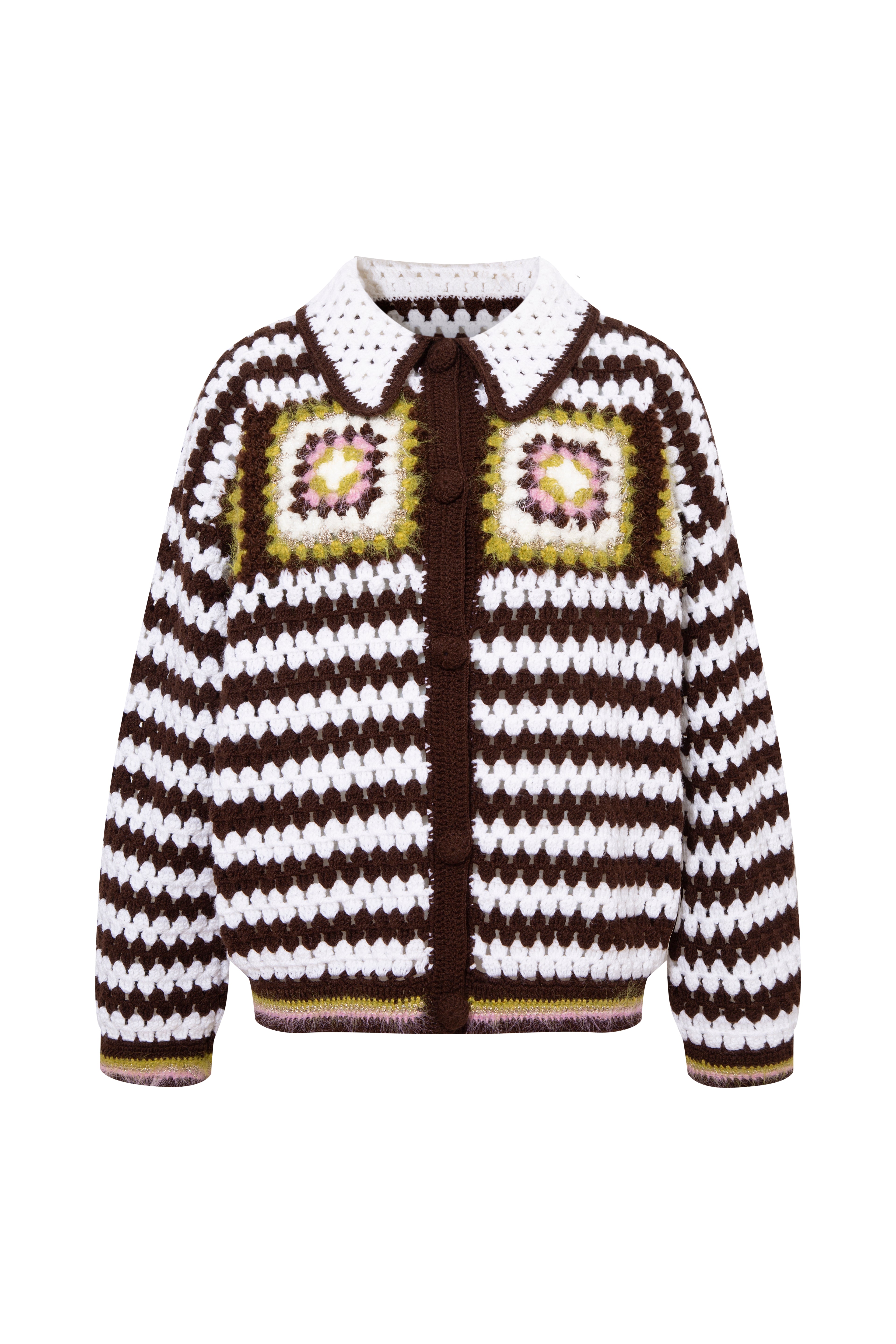A distinctive hand-knitted jacket that reimagines classic tailoring with artisanal crochet. Designed with a shirt collar and front button fastening, this silhouette features dropped shoulders for a relaxed fit. Square crochet motifs highlight the chest, while the striped knit body and ribbed cuffs and hem with colorful accents bring a playful contrast.