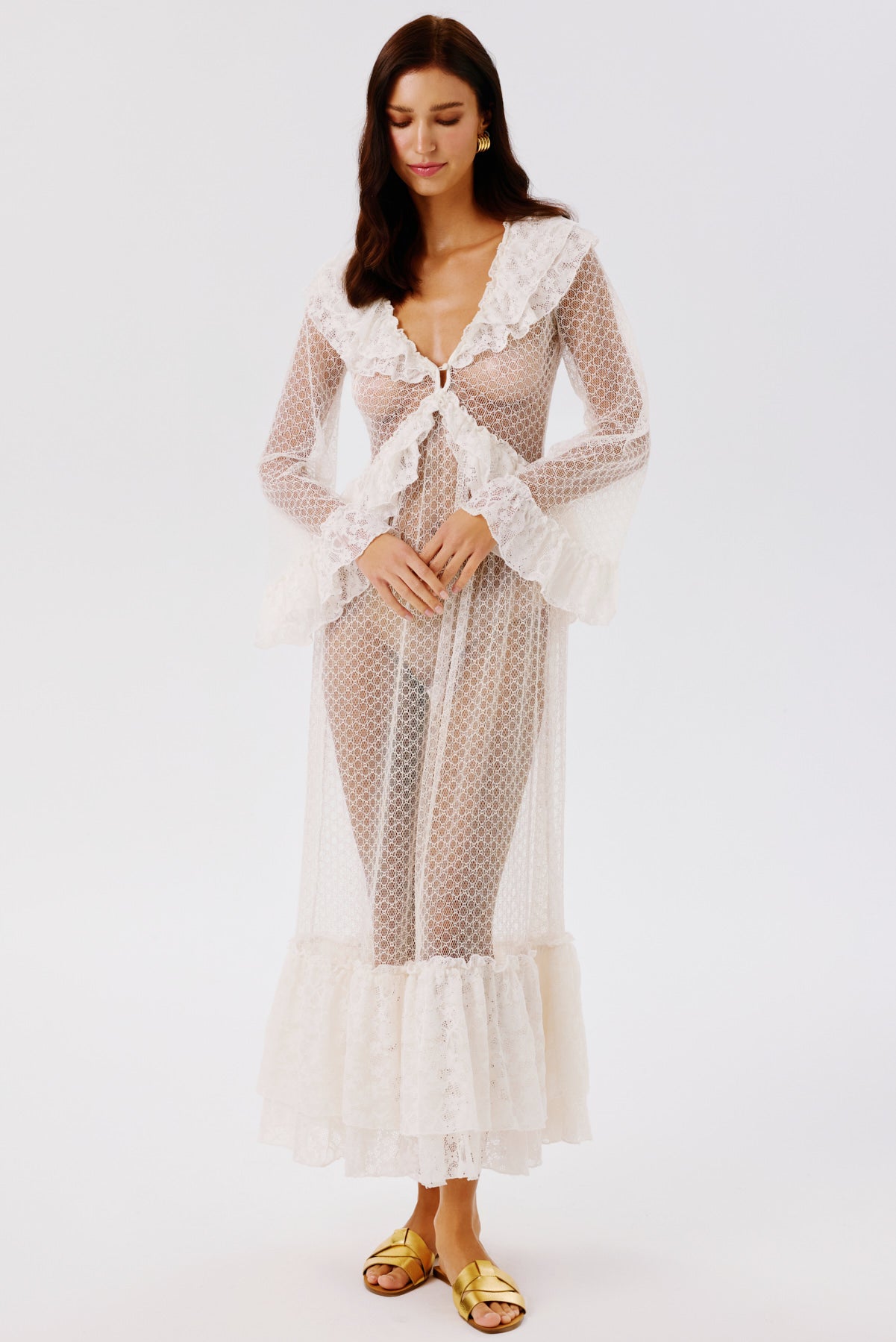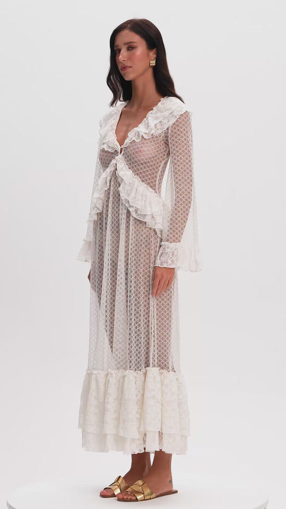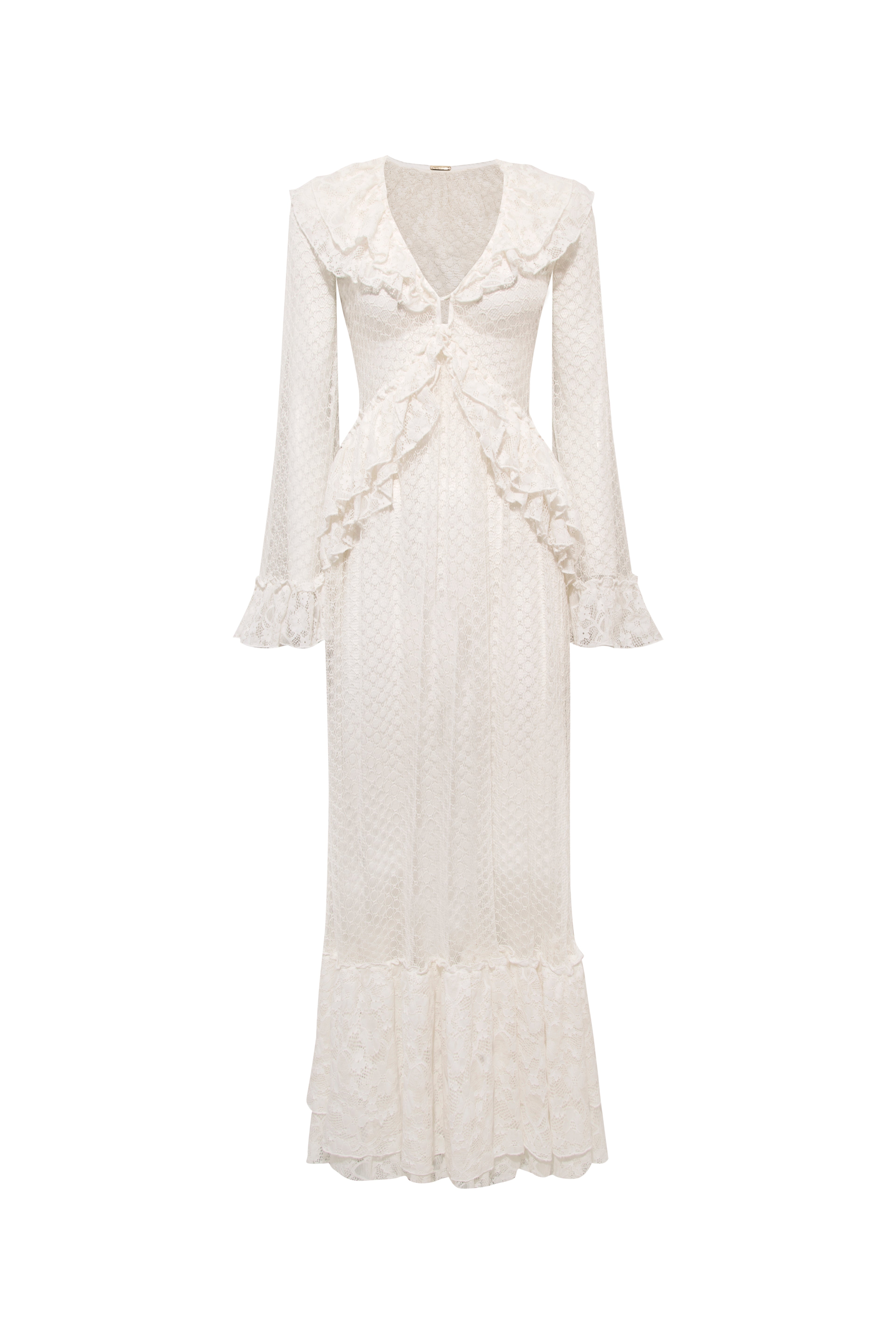 A romantic maxi lace dress featuring a harmonious blend of different lace patterns. Designed with ruffle details, it exudes feminine elegance. Perfect for both special occasions and refined everyday wear.