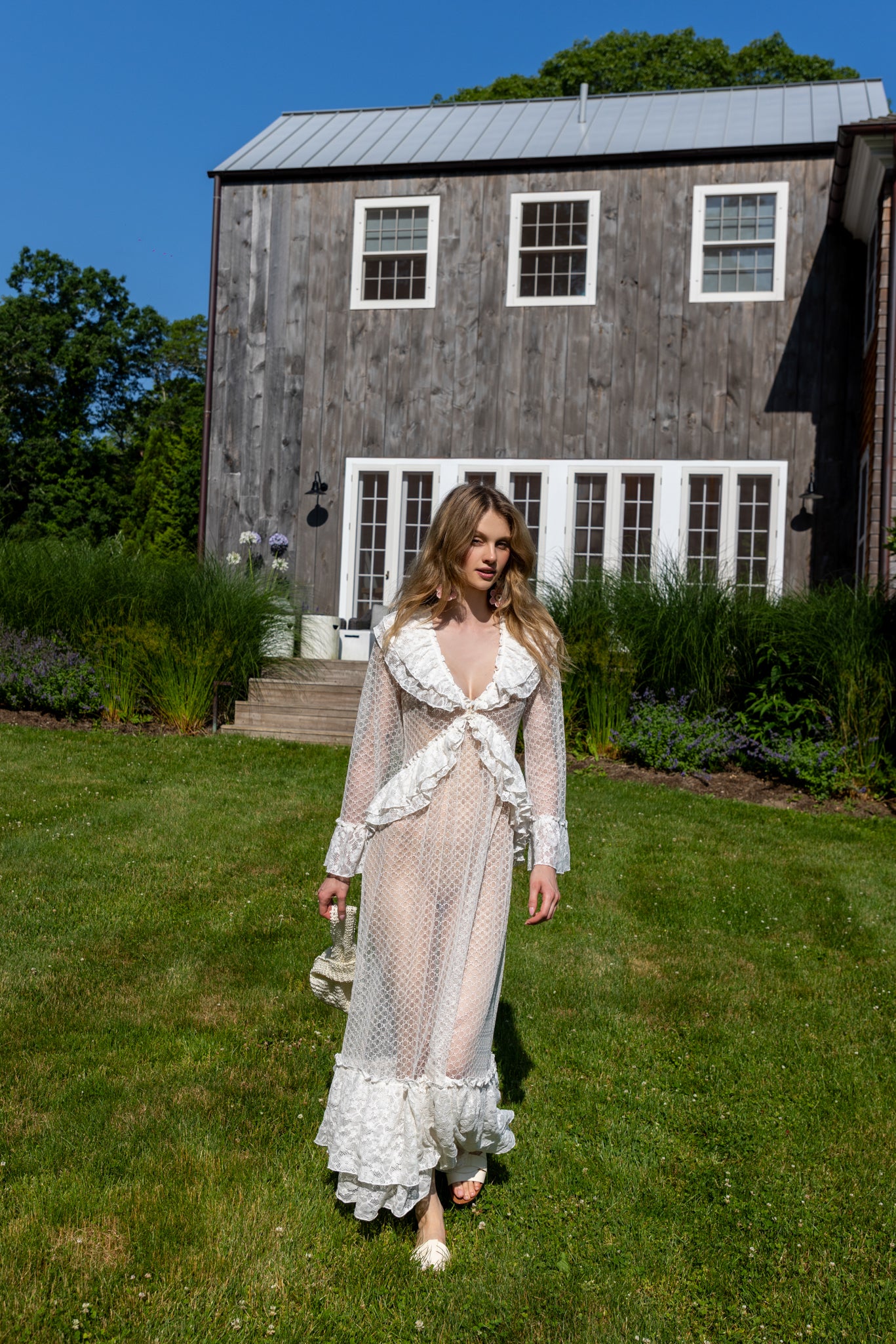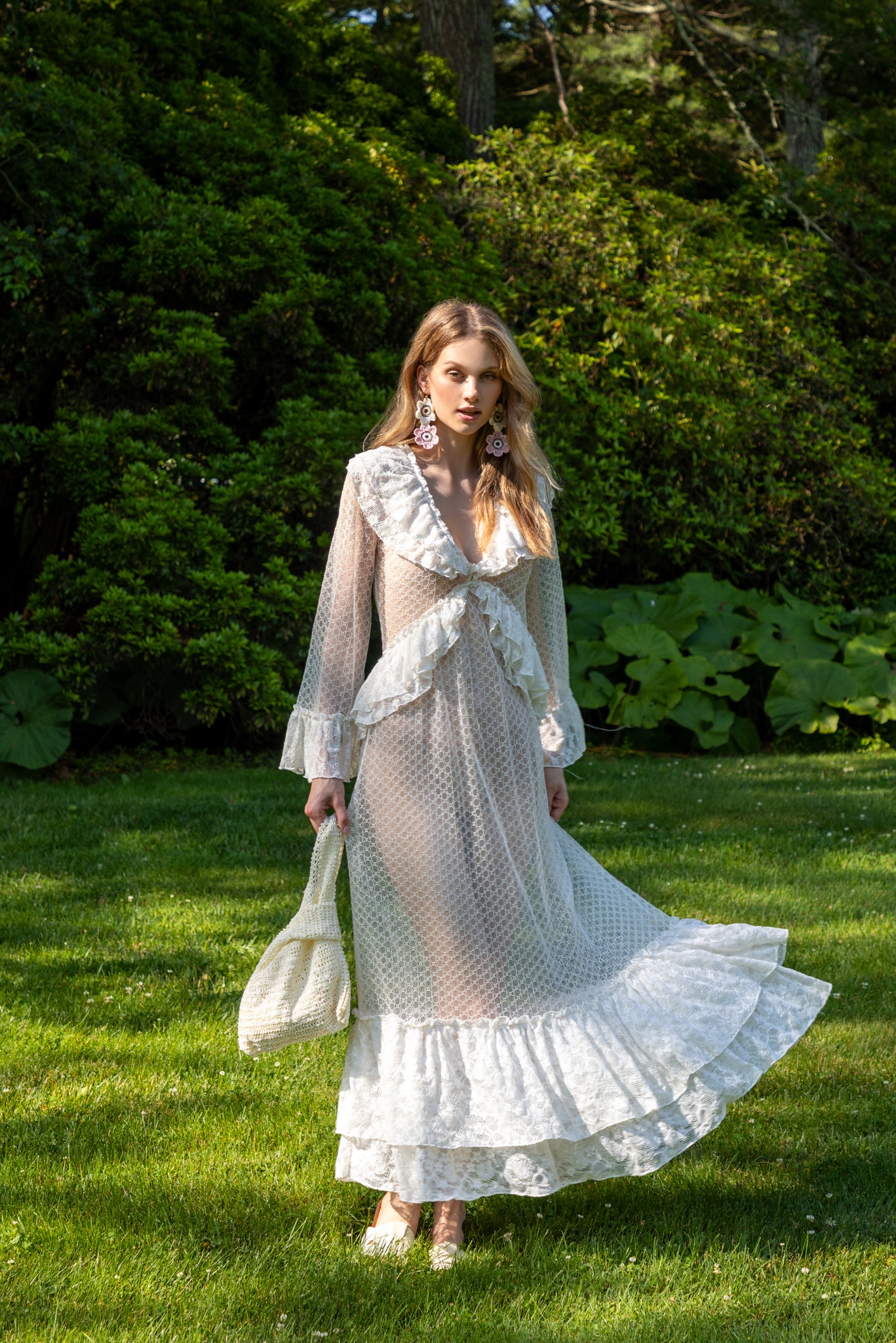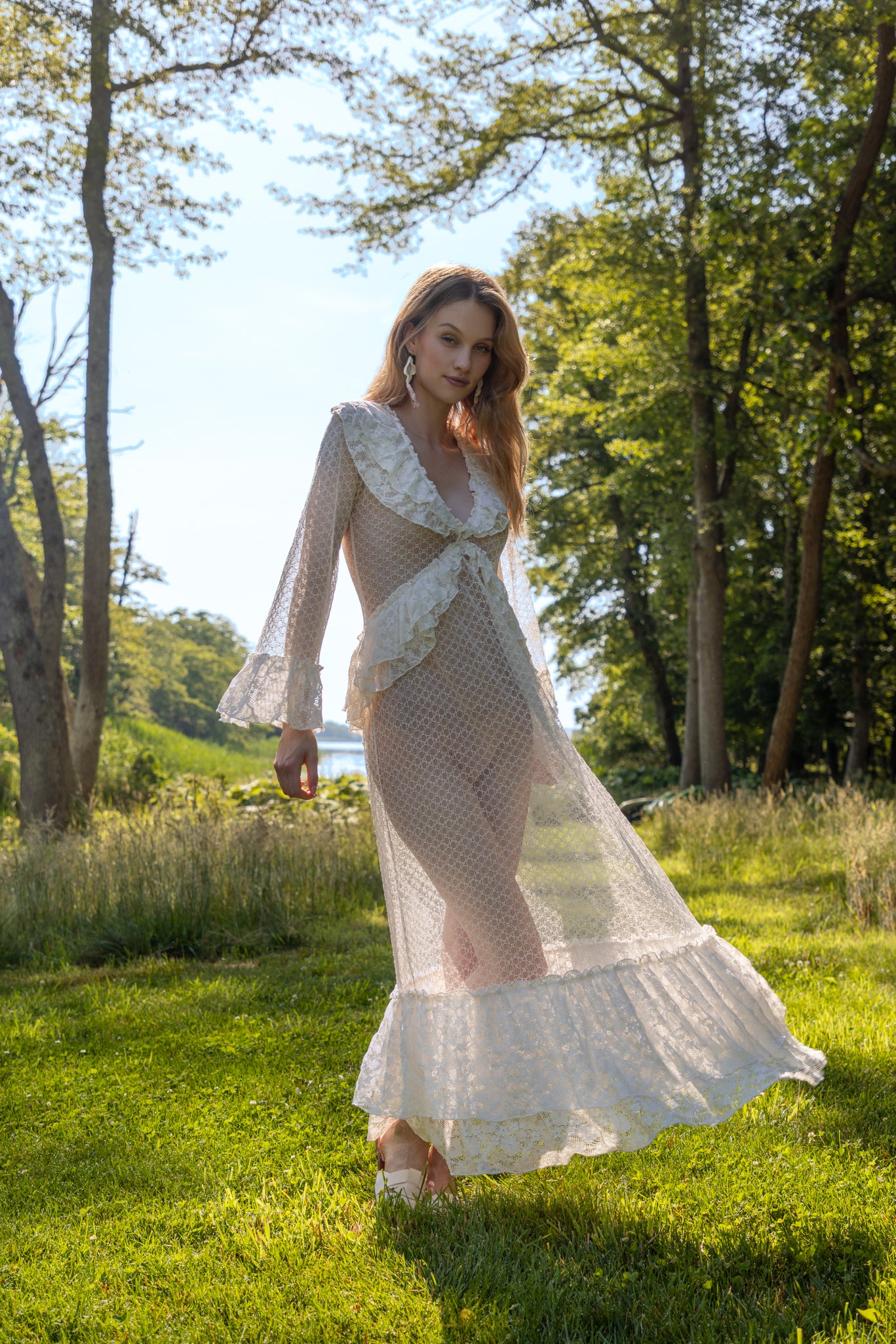 A romantic maxi lace dress featuring a harmonious blend of different lace patterns. Designed with ruffle details, it exudes feminine elegance. Perfect for both special occasions and refined everyday wear.