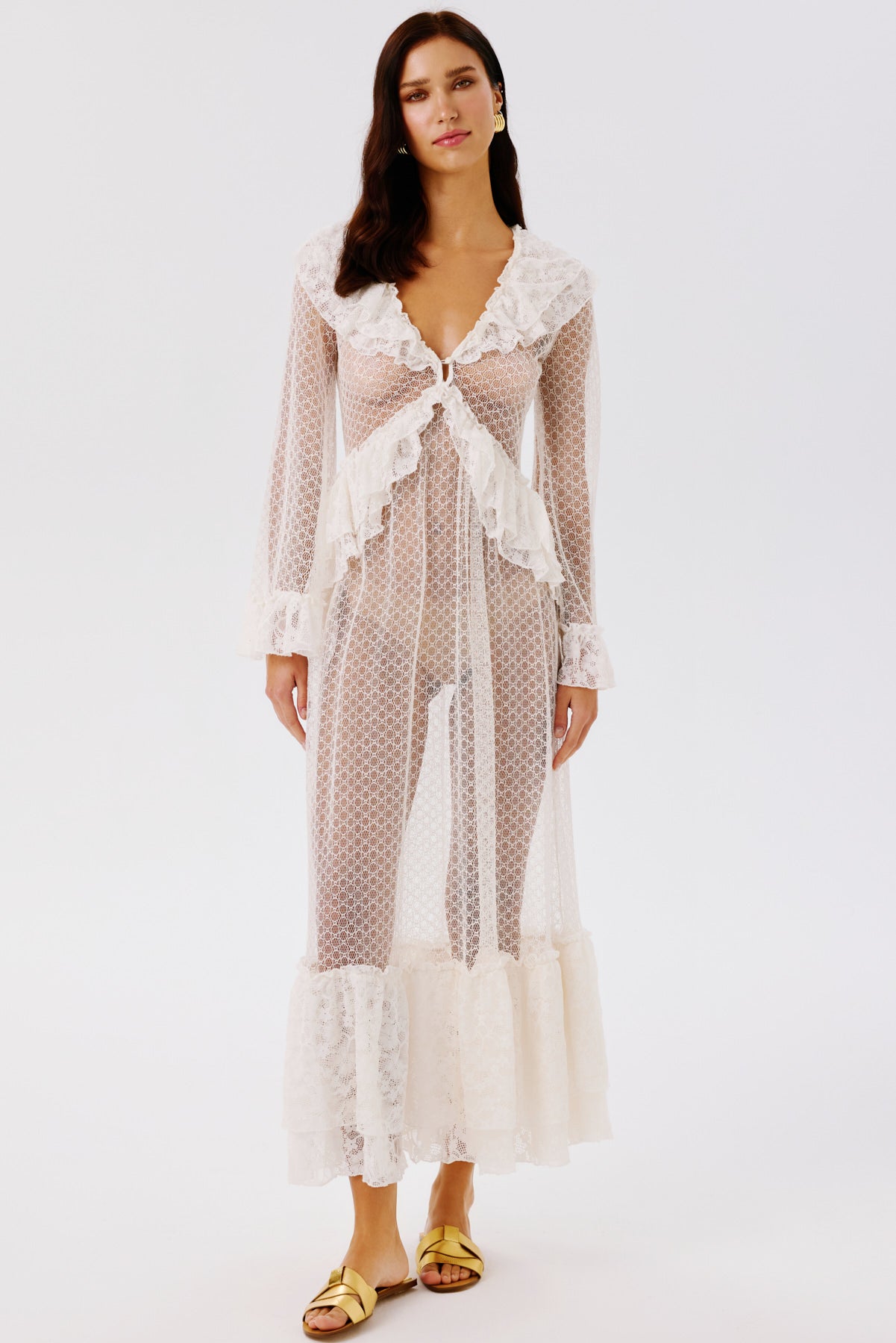 Ruffle details on neckline, bodice, sleeve cuffs, and hem