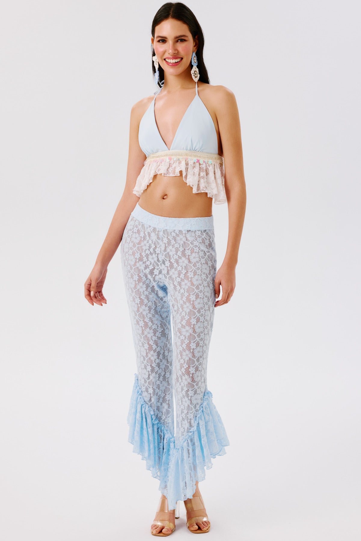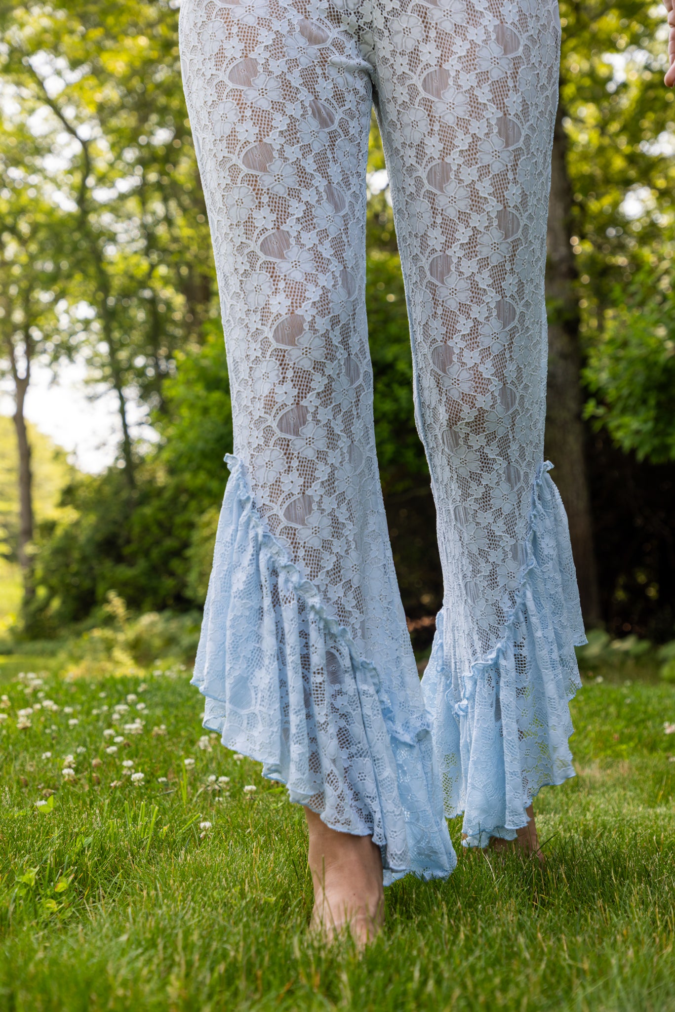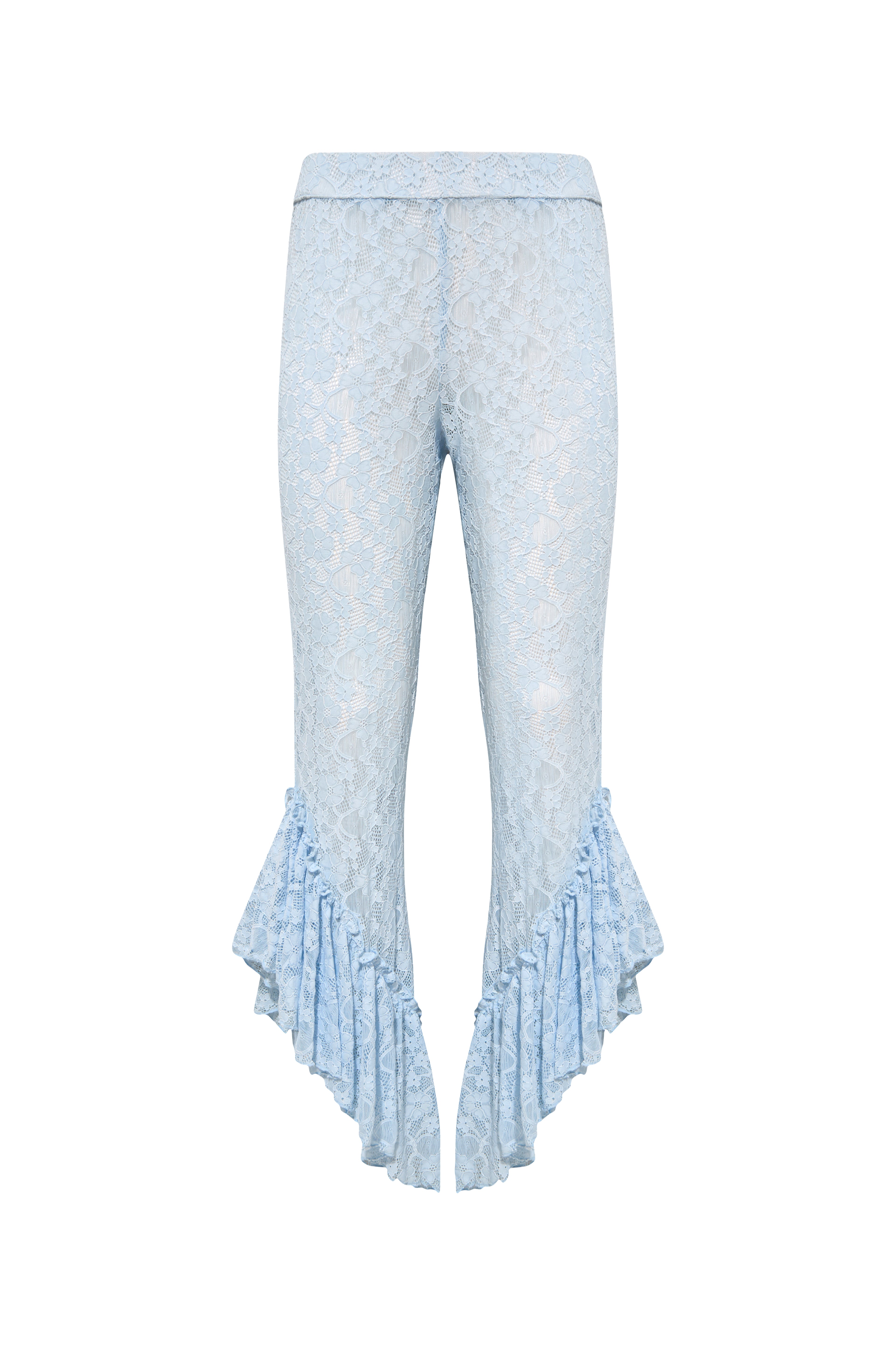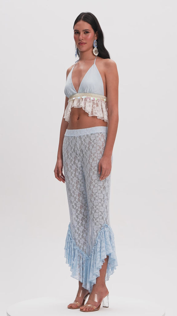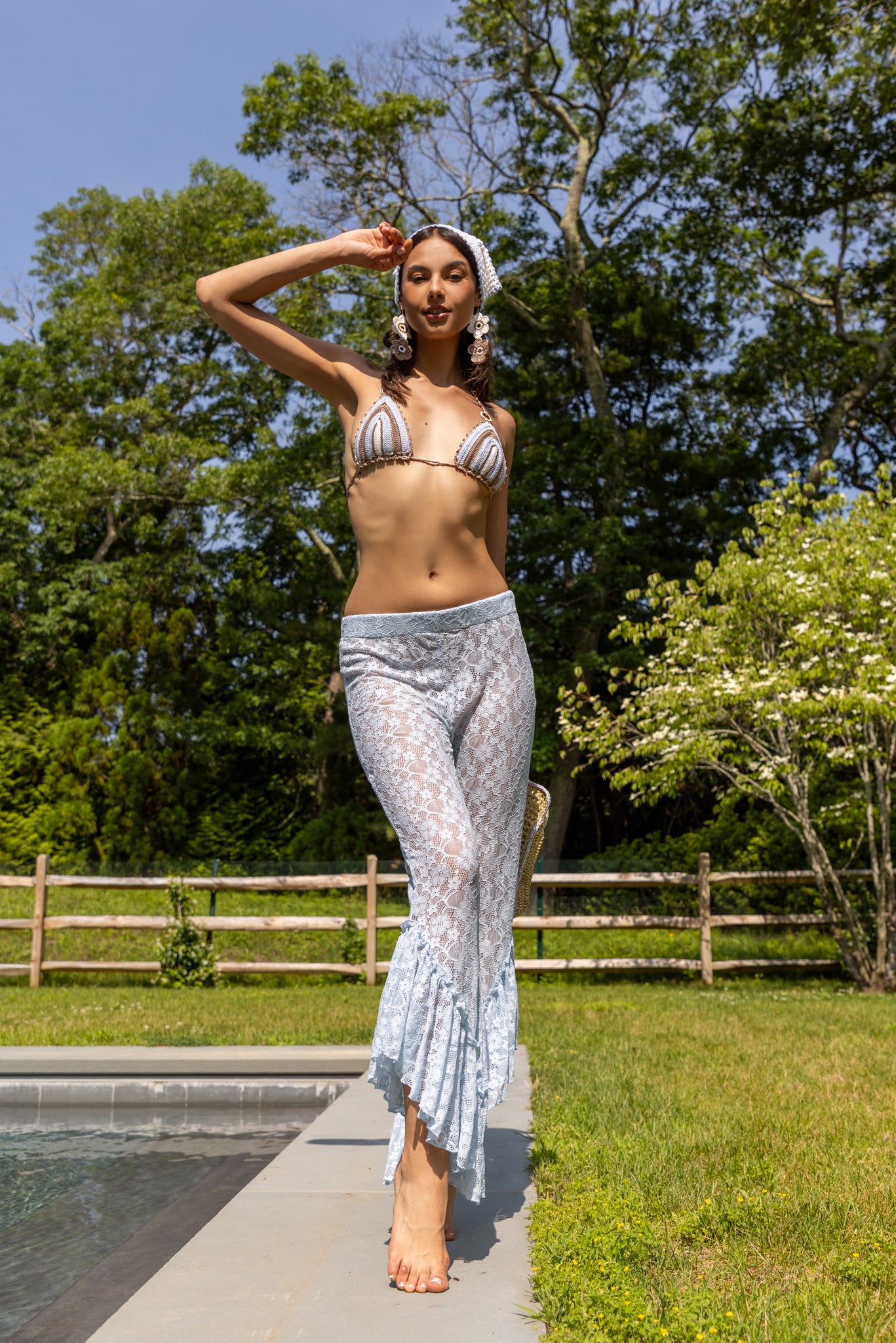 A refined lace pant that captures effortless summer sophistication. Designed with a waistband for comfort and a flattering, body-hugging fit, it flows into asymmetrical ruffled hems for a graceful finish. Perfect for evening occasions or elevated daytime styling.