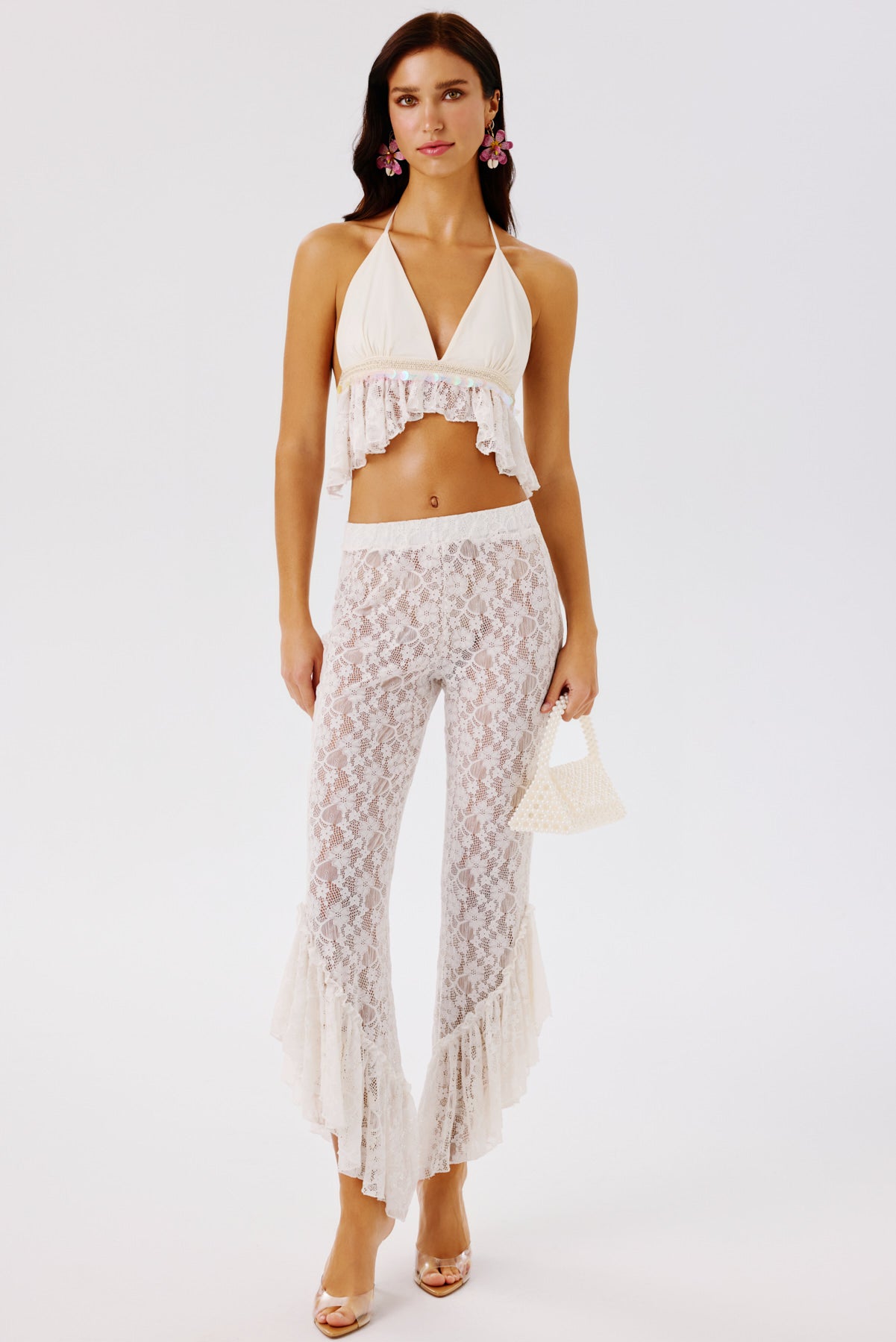 A refined lace pant that captures effortless summer sophistication. Designed with a waistband for comfort and a flattering, body-hugging fit, it flows into asymmetrical ruffled hems for a graceful finish. Perfect for evening occasions or elevated daytime styling.