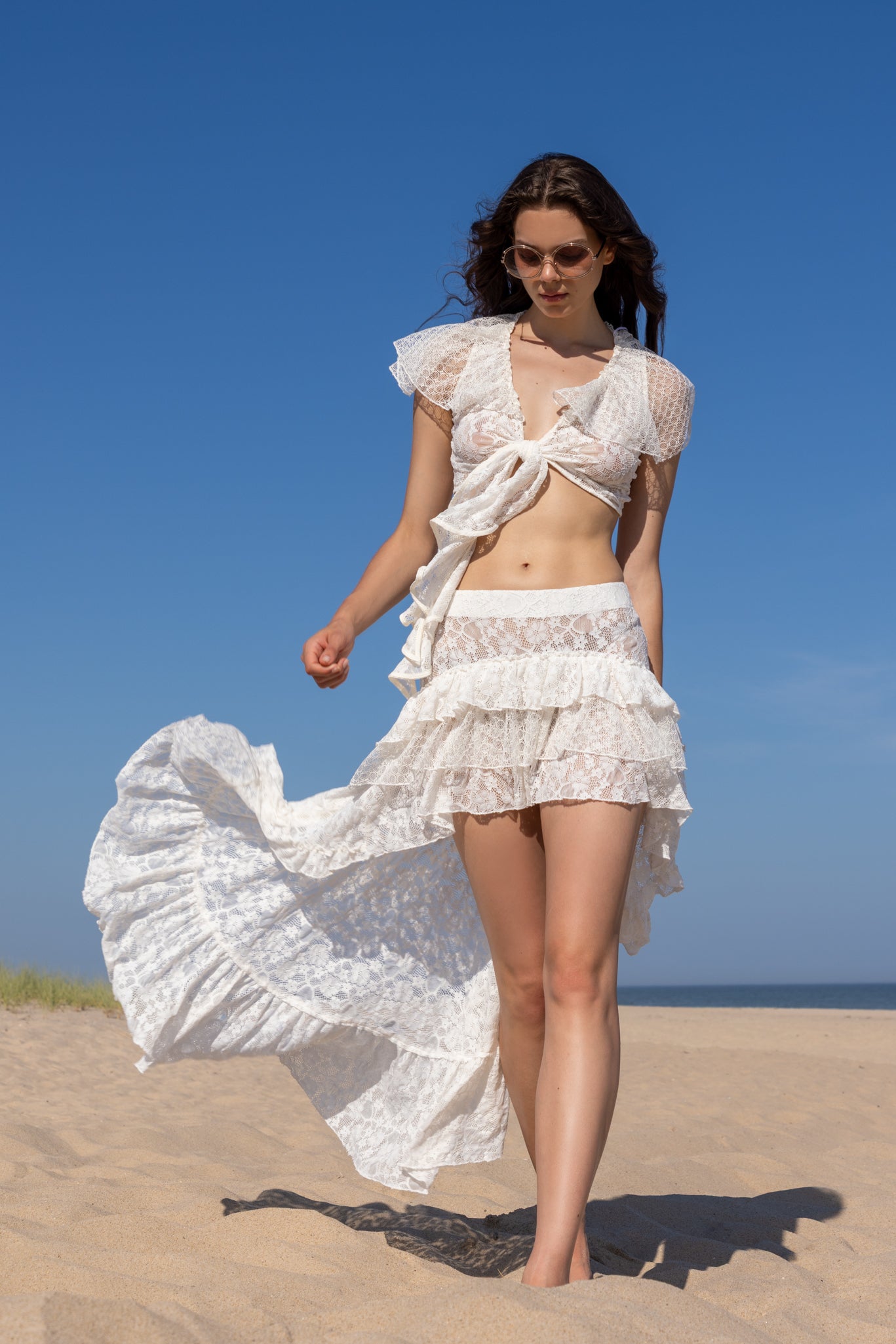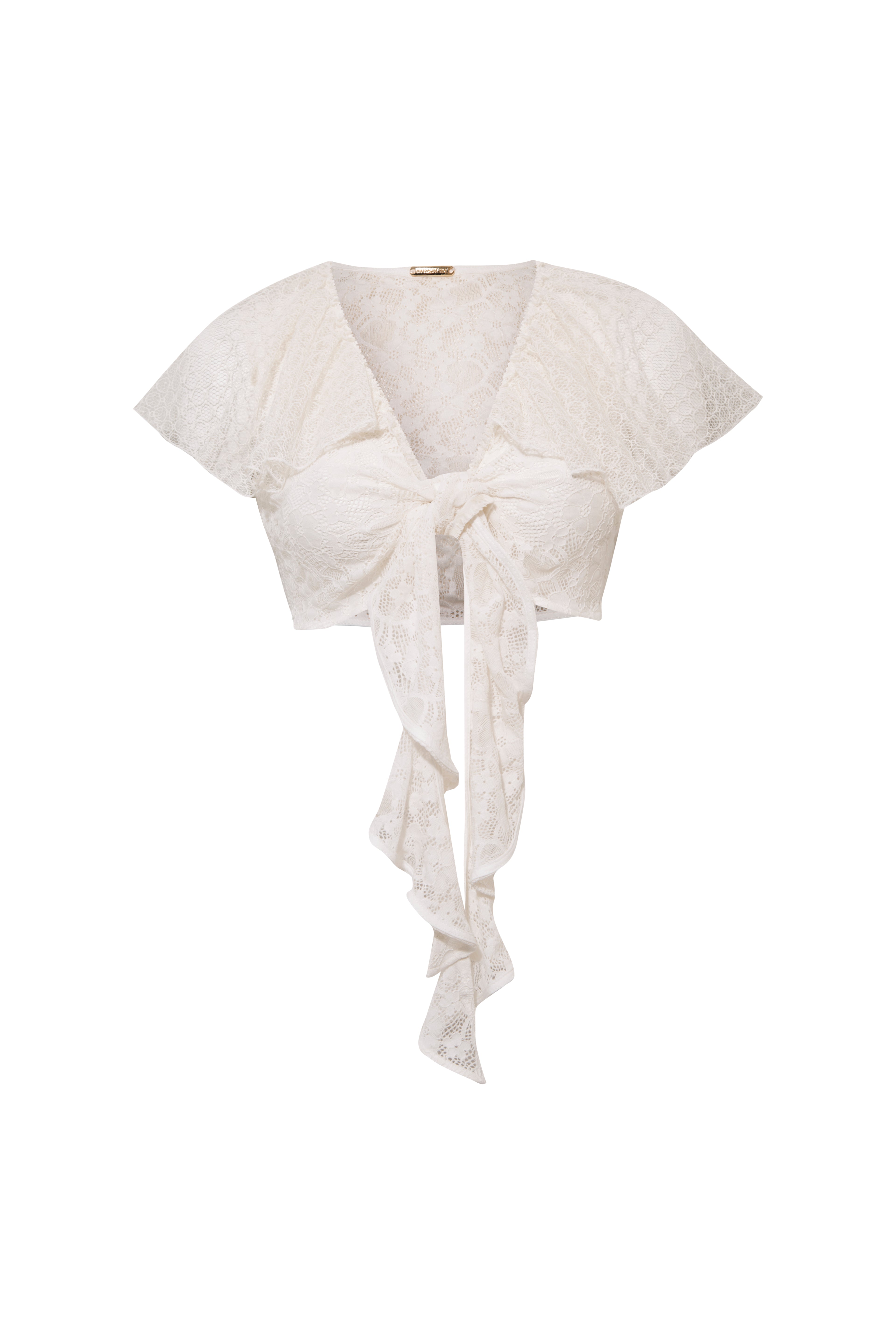 A feminine front-tie top designed with intricate lace details and playful ruffles. Featuring a tie closure at the bust and a ruffle along the neckline, it combines two distinct lace patterns for a romantic contrast. Perfect for pairing with skirts, shorts, or trousers for a versatile, elevated look.