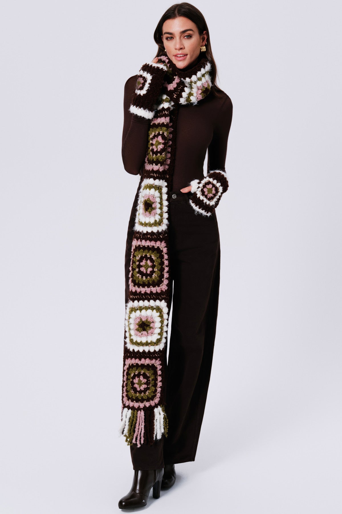 A hand-crafted scarf that brings artisanal charm and warmth to the collection. Made from alpaca wool, it features colorful square motifs pieced together in a block design, finished with playful tassels at the ends. Perfectly paired with the MADISON balaclava helmet hat and gloves for a coordinated look.