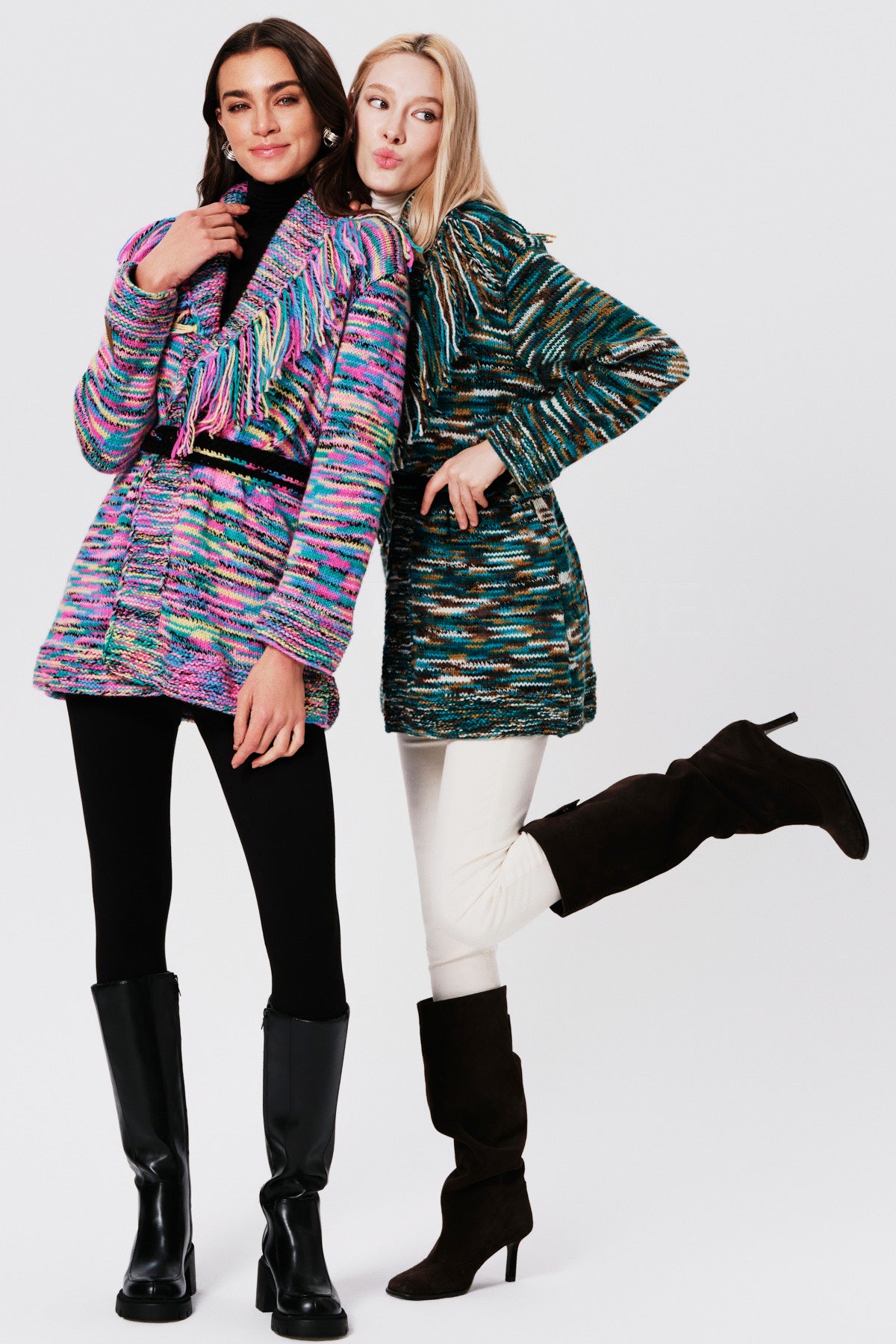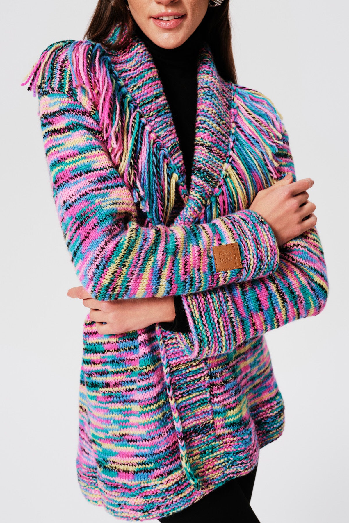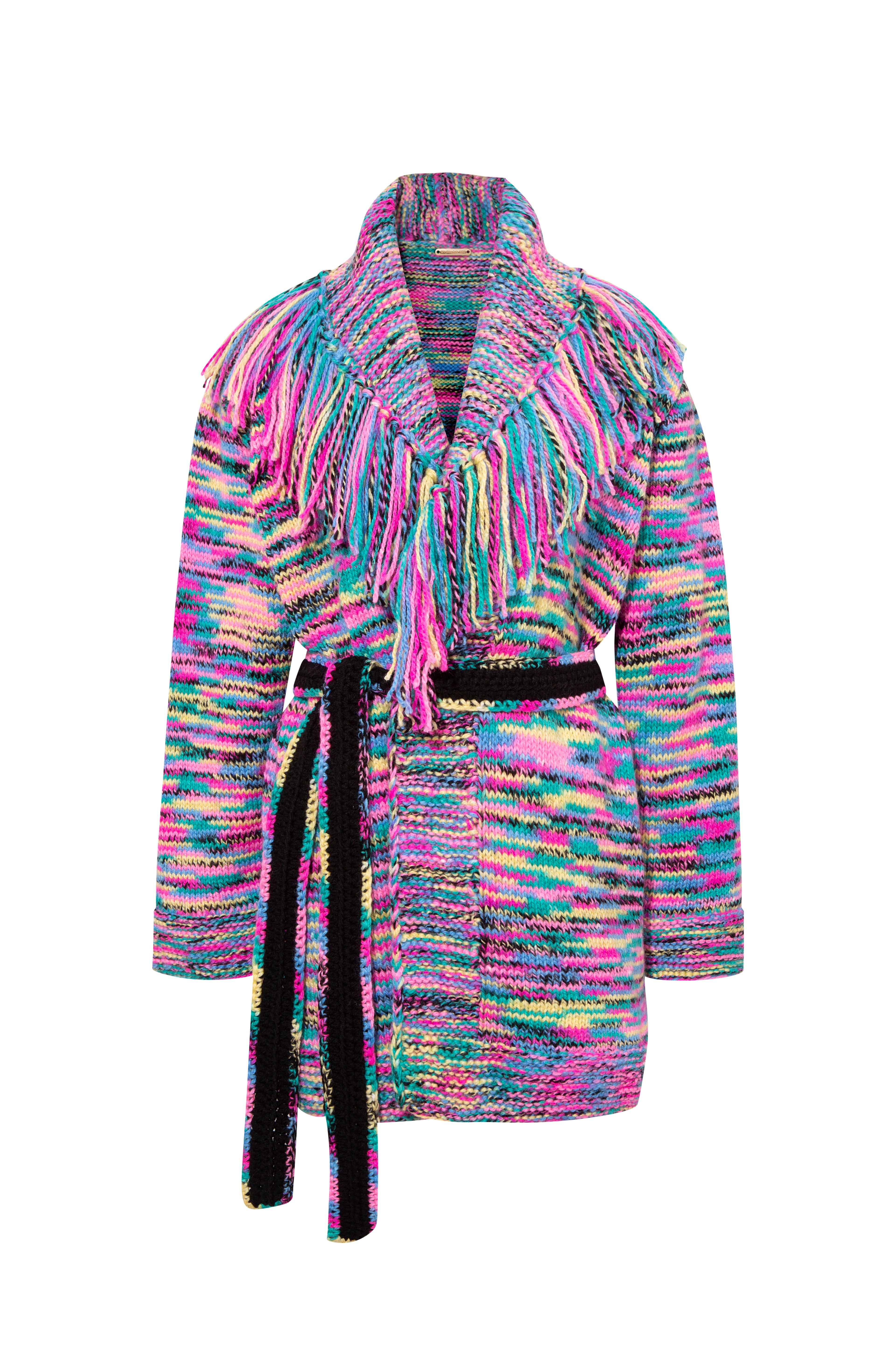 An ombré yarn cardigan in a beautiful gradient colorway, featuring a tie-detailed belted waist for a flattering silhouette. A leather logo patch at the cuff adds a subtle signature touch. This versatile piece transitions effortlessly from layering to a statement piece on its own.