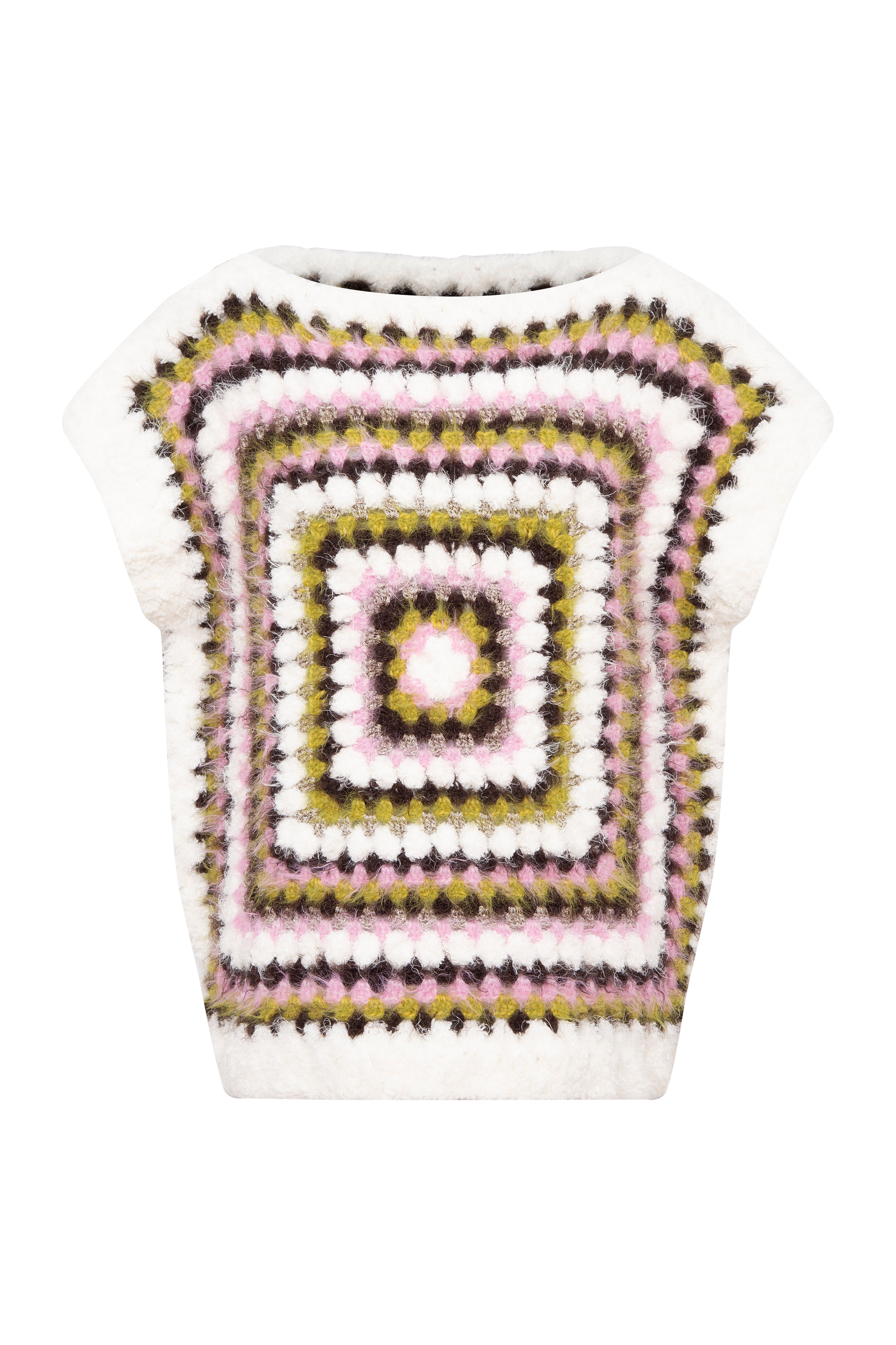 An artisanal vest that showcases the beauty of bold crochet motifs and rich color transitions. Crafted from panels at the front and back, this hand-knitted piece highlights the graphic charm of geometric design. Designed for ease and individuality, it elevates cold-weather styling with artisanal charm.