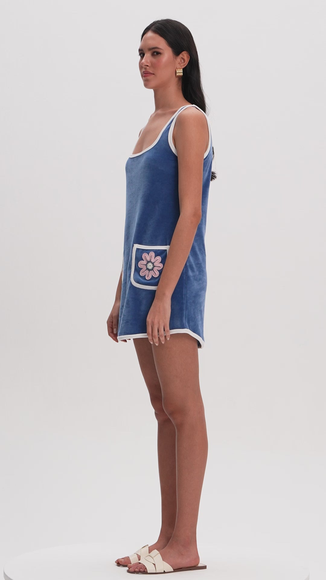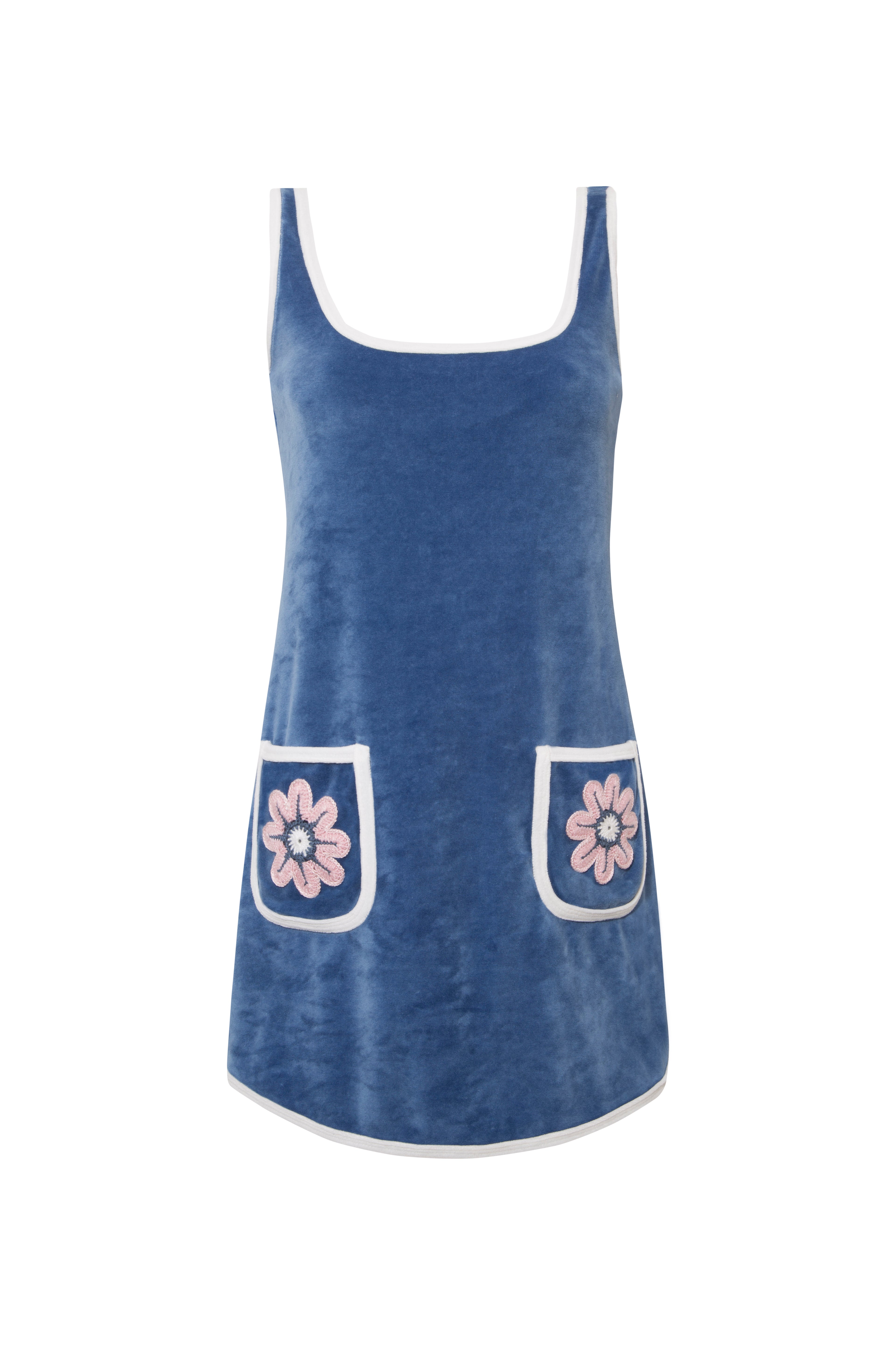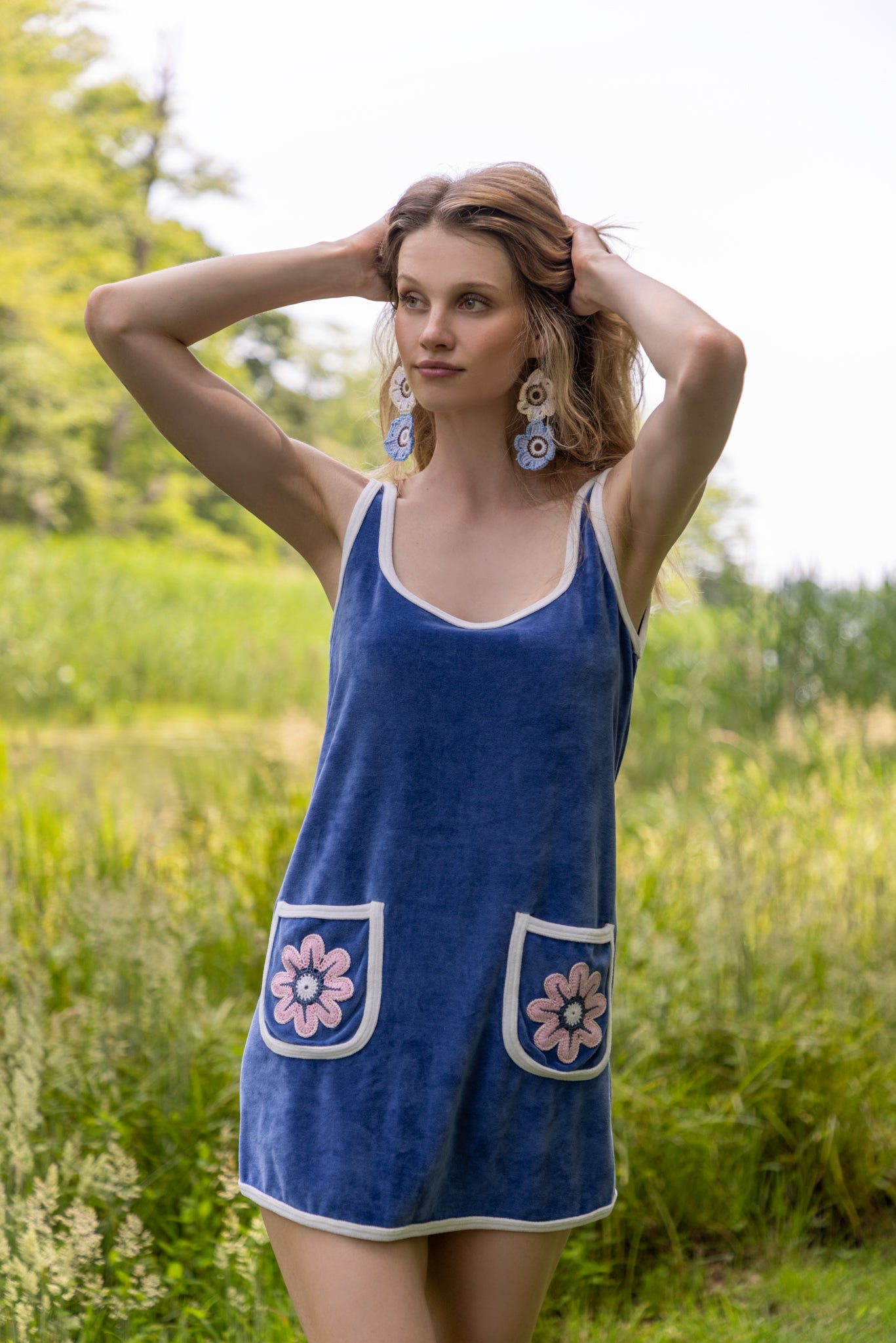 A playful retro-inspired terry velvet mini dress designed in a relaxed shift silhouette. It is detailed with contrasting trims along the neckline, armholes, hem, and pocket edges. Two front pockets are adorned with hand-knitted colorful floral patch motifs, adding a charming artisanal touch. Perfect for both beachwear and everyday styling.