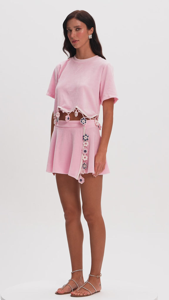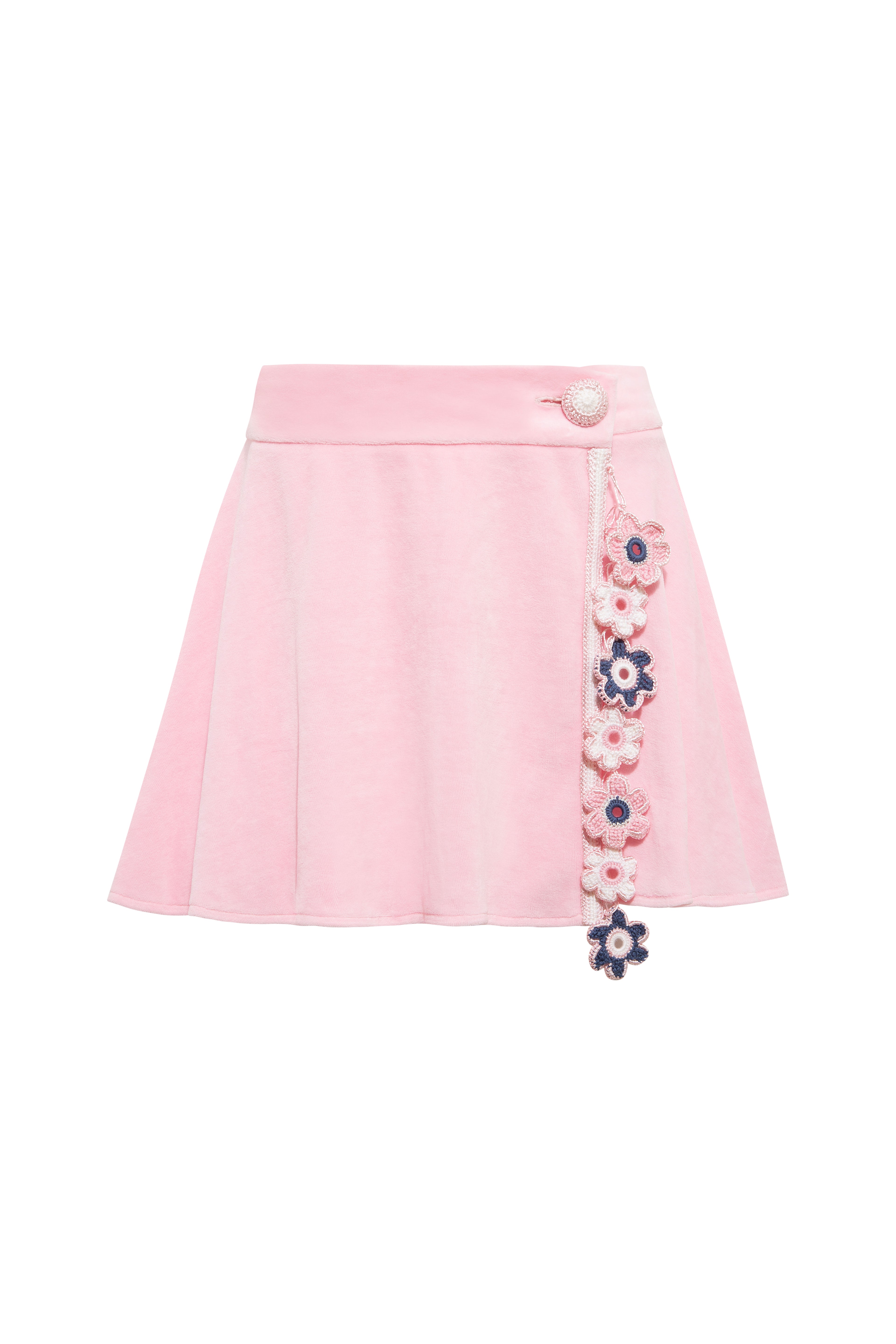 Our signature design, this wrap mini skirt blends playful movement with artisanal detailing. It fastens at the waist with a hand-knitted button closure and is adorned at the front with a delicate dangling floral motif accessory. Perfect for creating coordinated looks or styled individually for a chic summer statement.