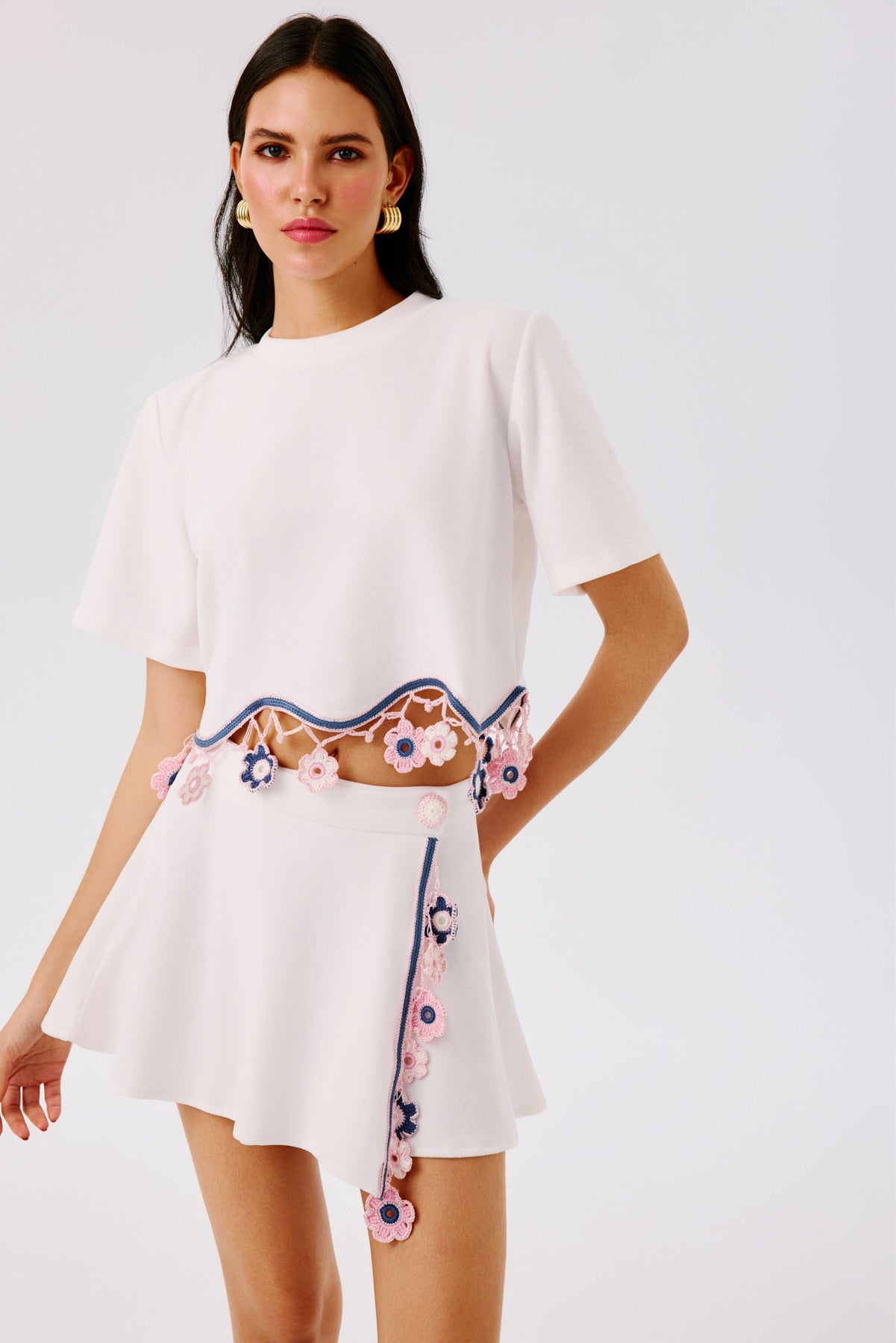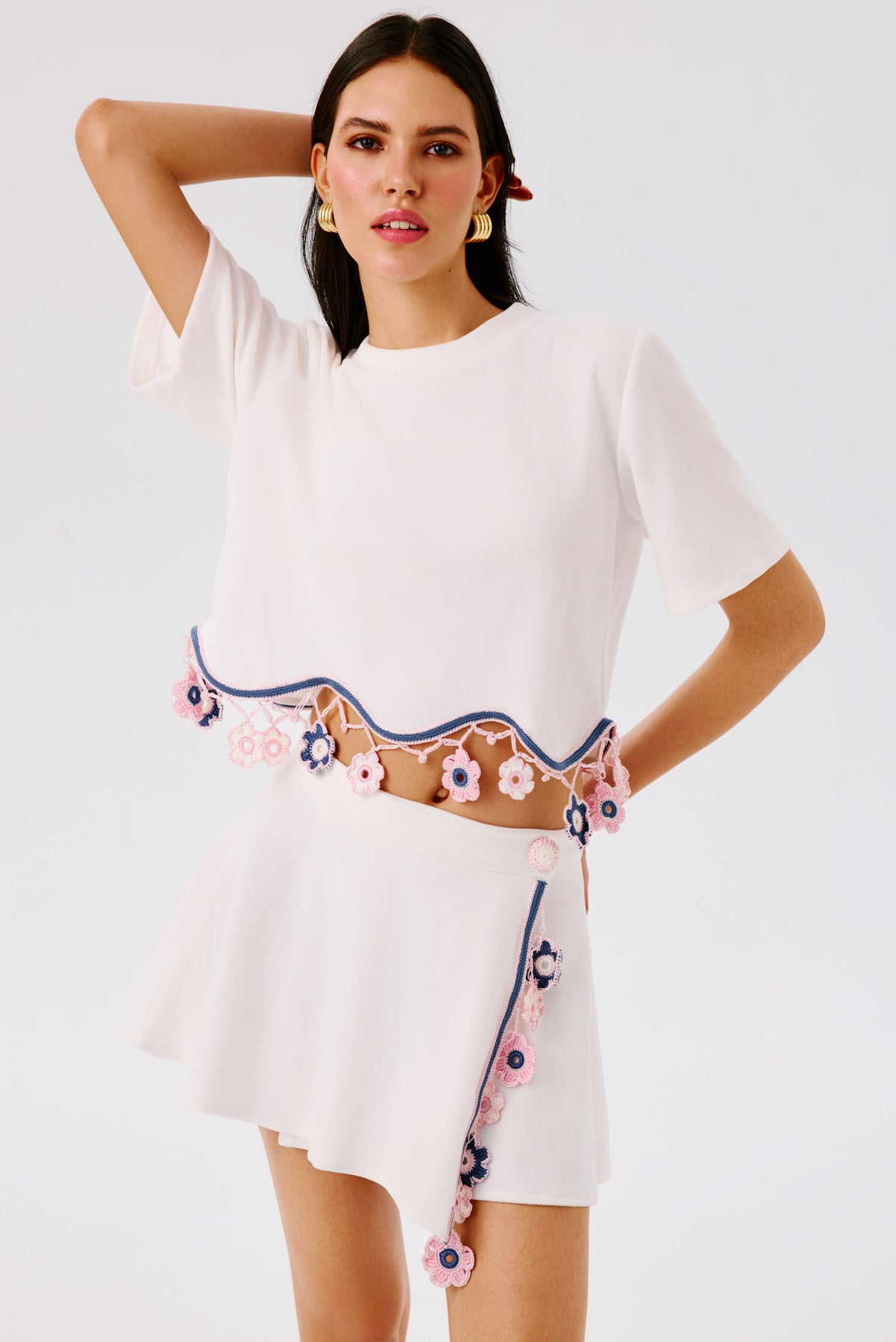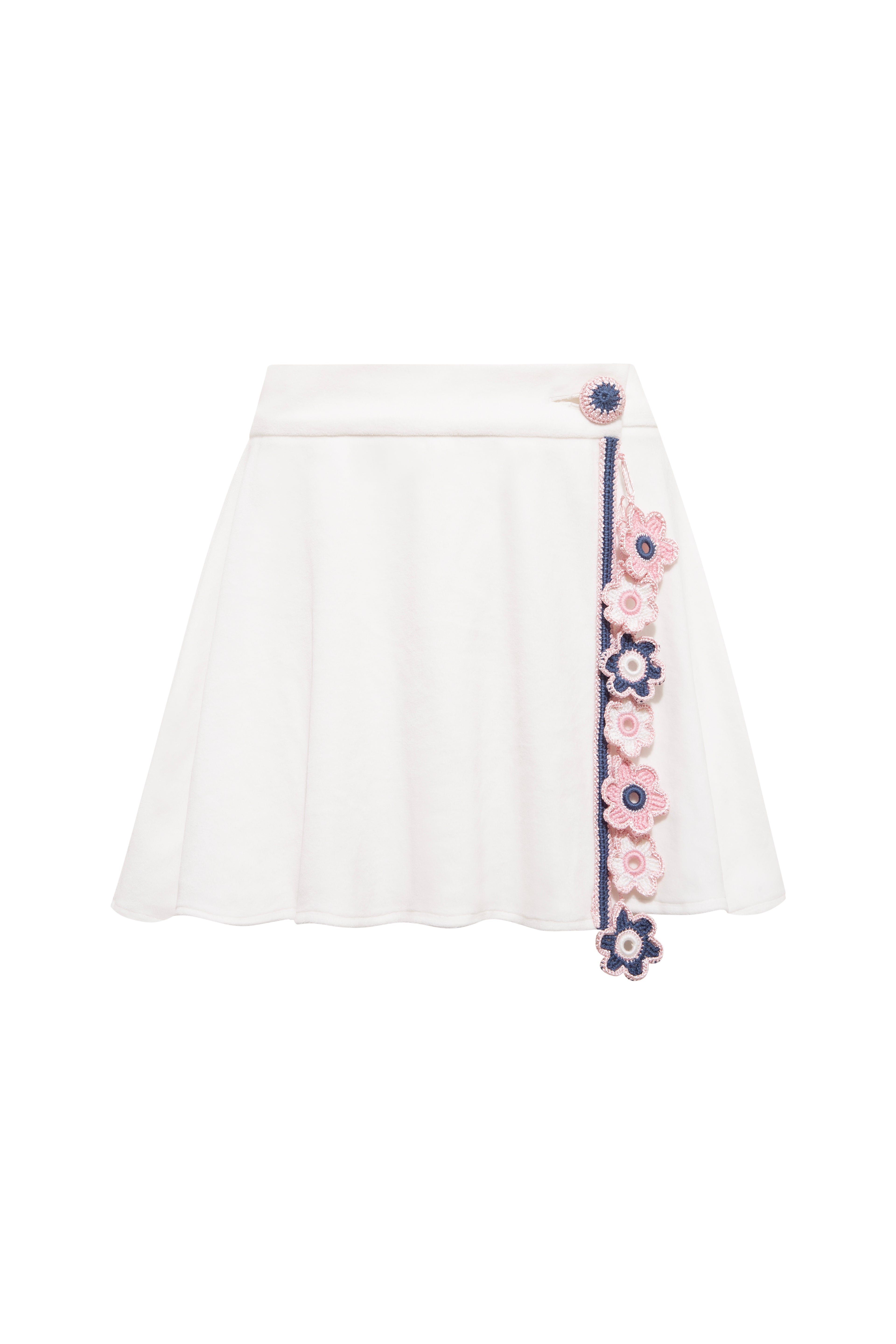 Our signature design, this wrap mini skirt blends playful movement with artisanal detailing. It fastens at the waist with a hand-knitted button closure and is adorned at the front with a delicate dangling floral motif accessory. Perfect for creating coordinated looks or styled individually for a chic summer statement.