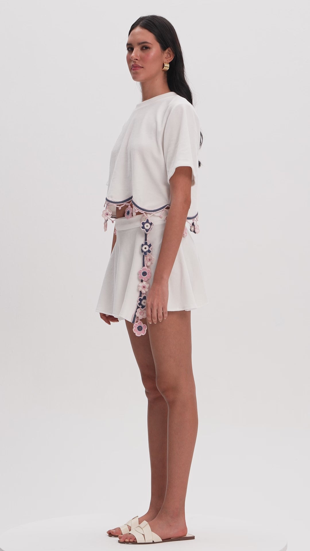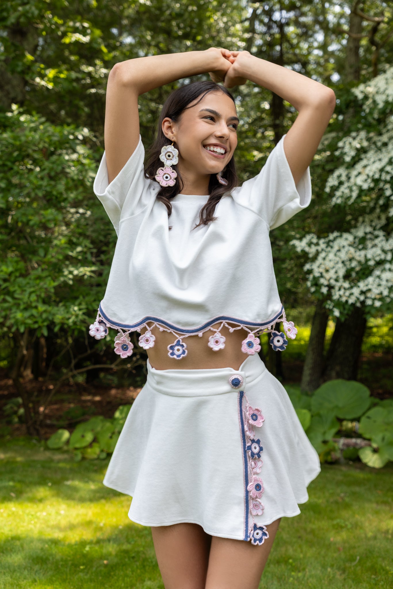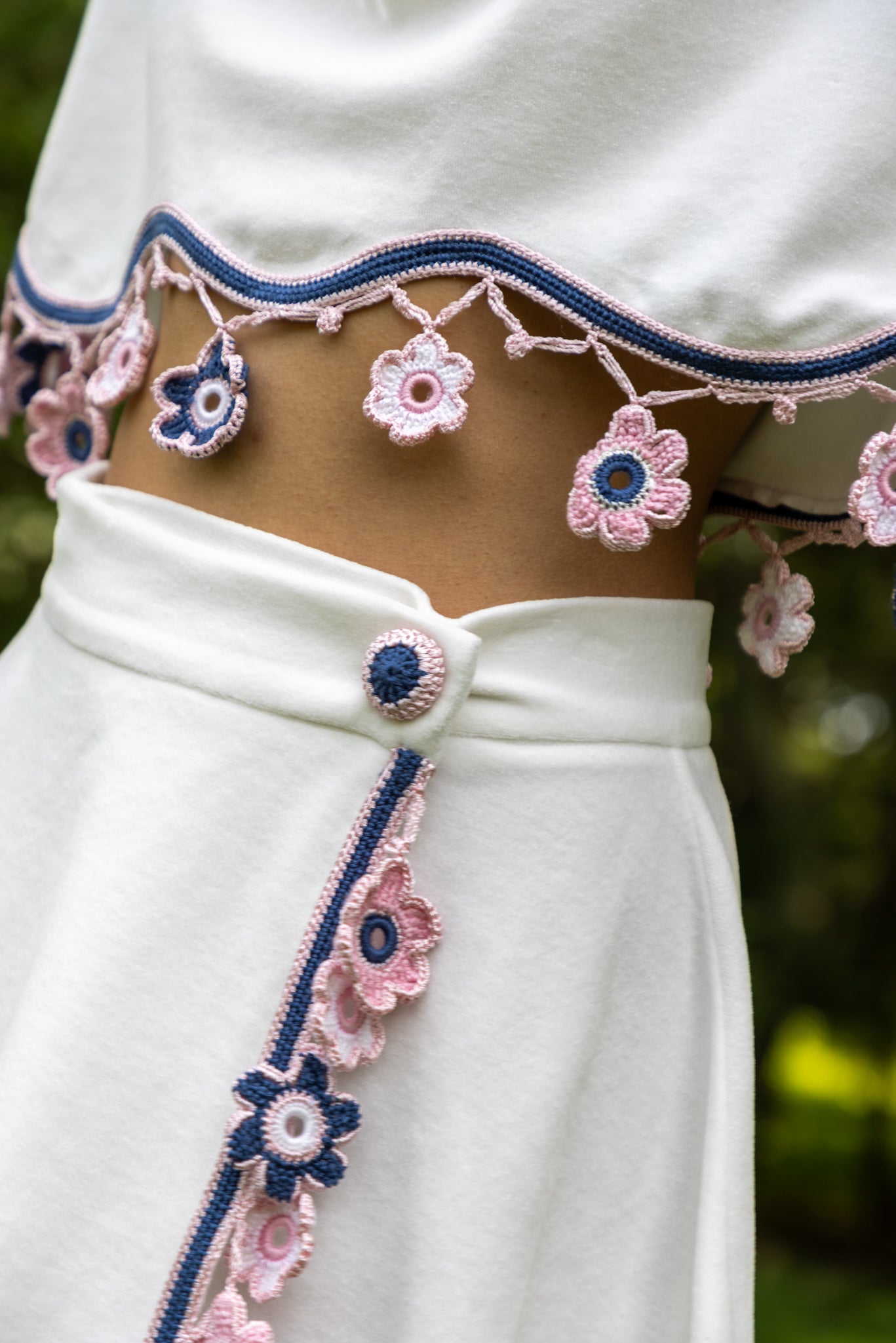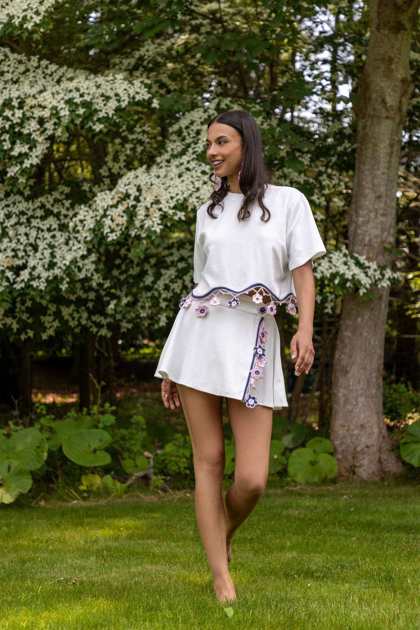 Our signature design, this wrap mini skirt blends playful movement with artisanal detailing. It fastens at the waist with a hand-knitted button closure and is adorned at the front with a delicate dangling floral motif accessory. Perfect for creating coordinated looks or styled individually for a chic summer statement.