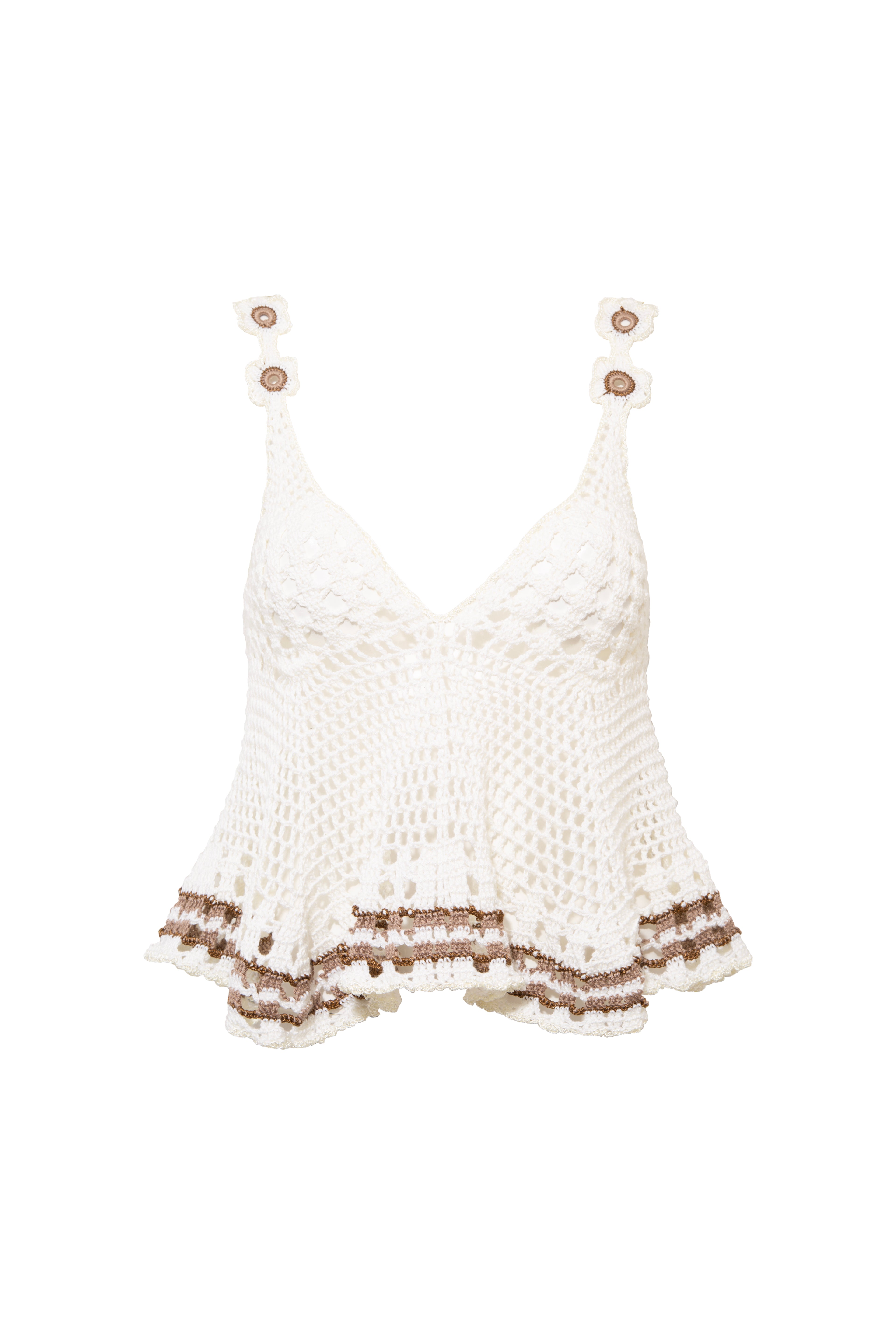 A hand-crocheted, floral-accented camisole top designed with effortless elegance. Featuring delicate straps adorned with charming crochet flower motifs, it captures a breezy, handcrafted aesthetic. Perfectly paired with the matching mini skirt or styled alone for a light, versatile summer statement.