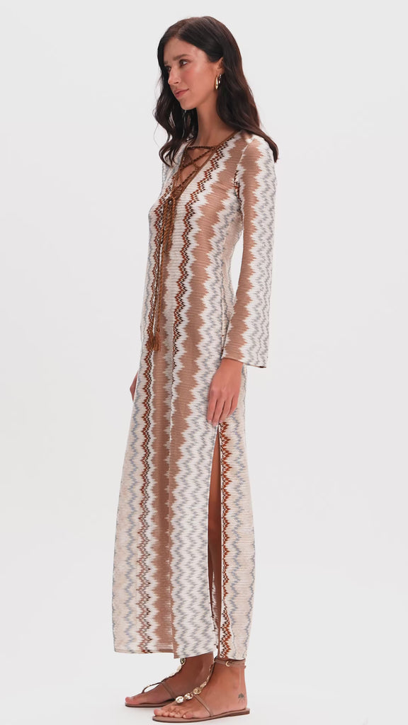 A flowing maxi caftan dress that embodies effortless summer elegance. Designed with a V-neckline and hand-knitted twisted tassel ties that cross at the front, it features side slits for added movement. Perfect for seaside moments or elevated daytime styling.