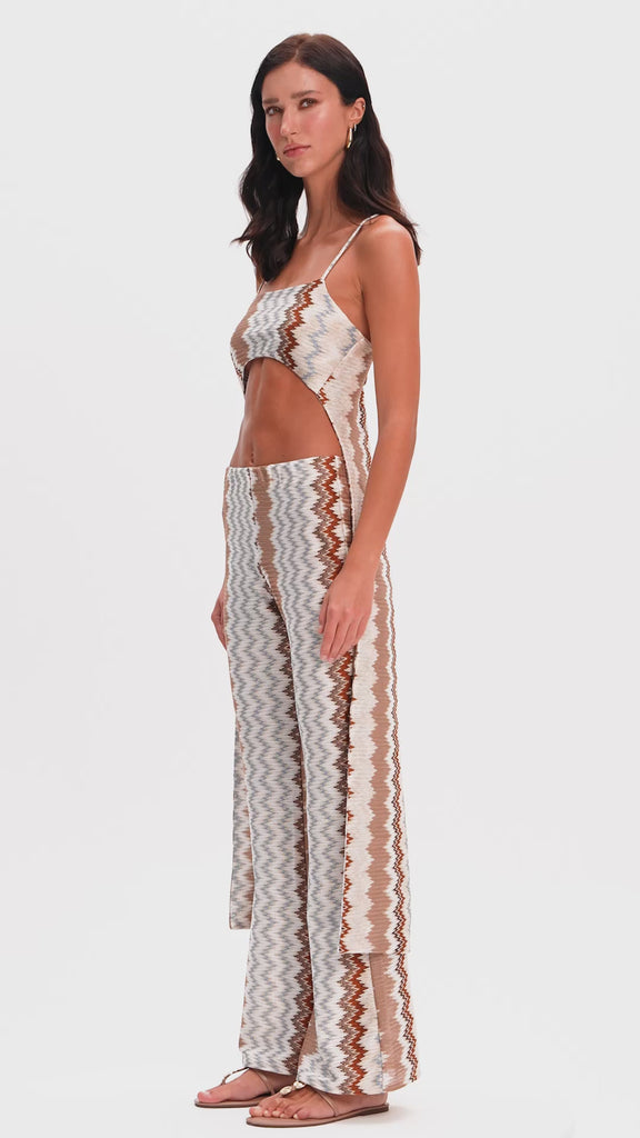 A standout piece designed to move with ease and confidence. Crafted from a signature zigzag-patterned fabric, this flared pant combines comfort with effortless sophistication. The waistband ensures a relaxed fit, while its fluid drape makes it perfect for both daytime styling and evening moments.