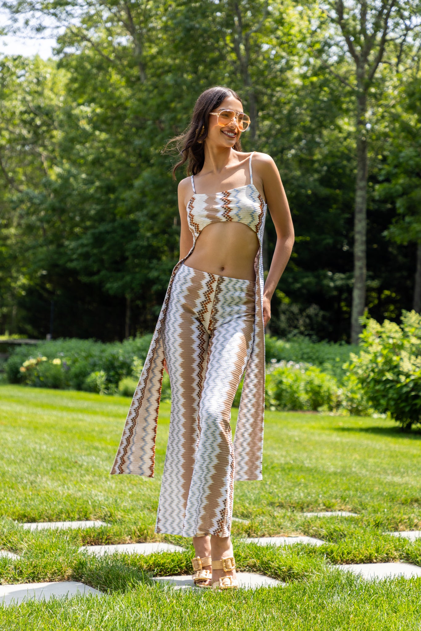 Striking strappy top with a modern, asymmetric silhouette. Designed with an open back and adjustable tie fastening, its super-cropped front extends into elongated sides, creating a sculptural, contemporary look. Versatile and bold, it transitions effortlessly from day to night styling.