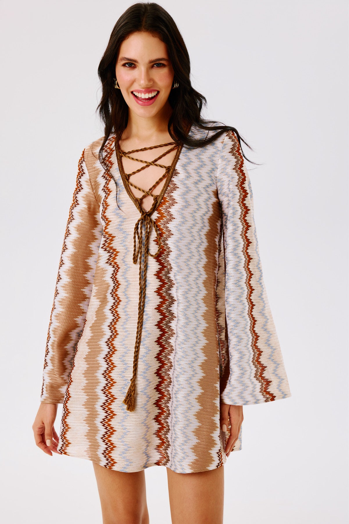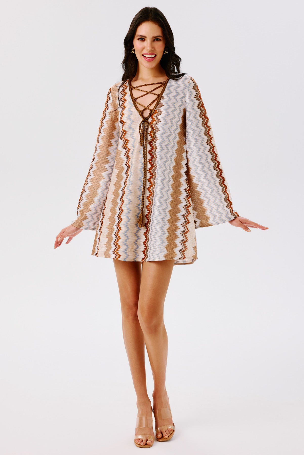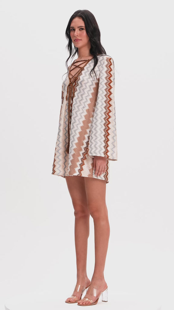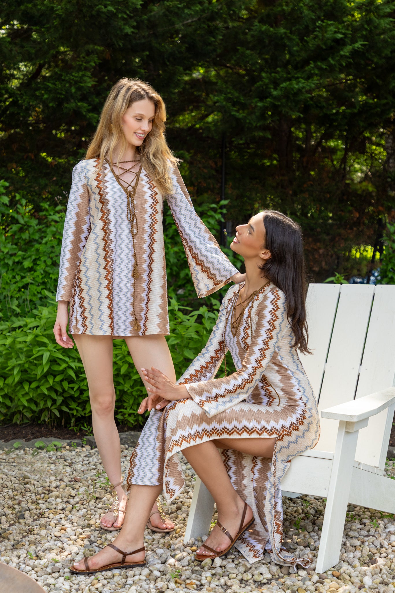 A breezy mini caftan dress designed with an easy, feminine silhouette. Featuring a V-neckline with hand-knitted twisted tassel ties that cross elegantly at the front, this style blends artisanal charm with effortless wearability. Perfect as a beach cover-up or styled for relaxed daytime looks.